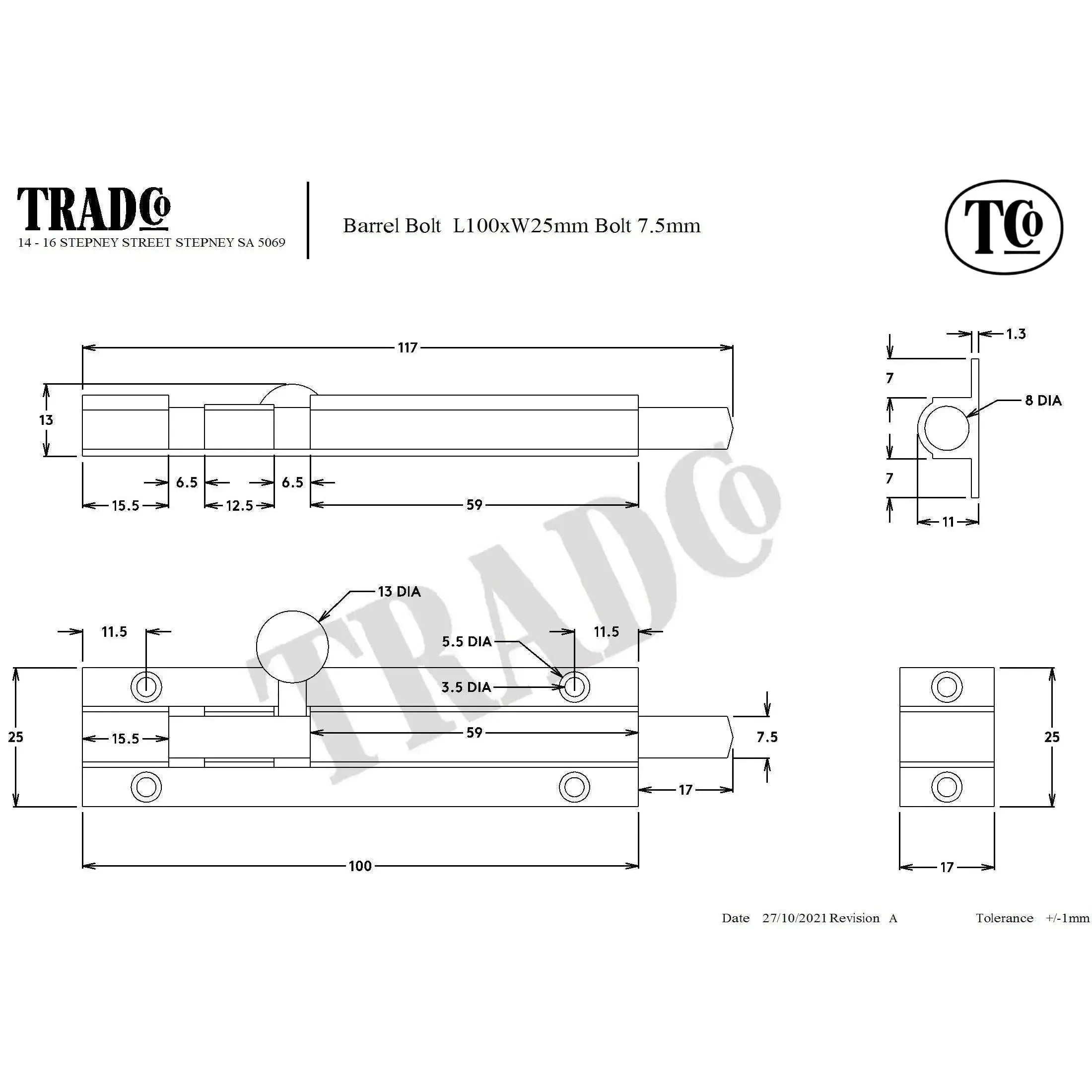 Tradco Barrel Bolt Satin Brass L100mm