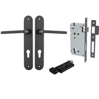 Included in Kit: Door Lever Baltimore Oval Euro Matt Black CTC85mm H240xW40xP55mm Entrance Kit, Mortice Lock Euro Matt Black CTC85mm Backset 60mm, Euro Cylinder Key Thumb 6 Pin Matt Black L70mm KA1