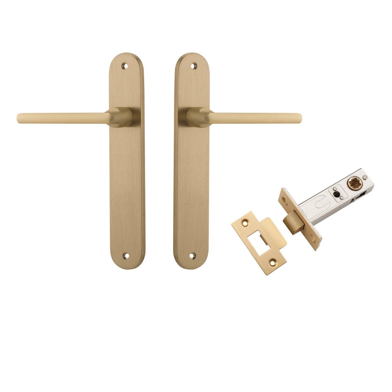 Included in Kit: Door Lever Baltimore Oval Latch Brushed Brass H237xW40xP55mm Passage Kit, Tube Latch Split Cam 'T' Striker Brushed Brass Backset 60mm