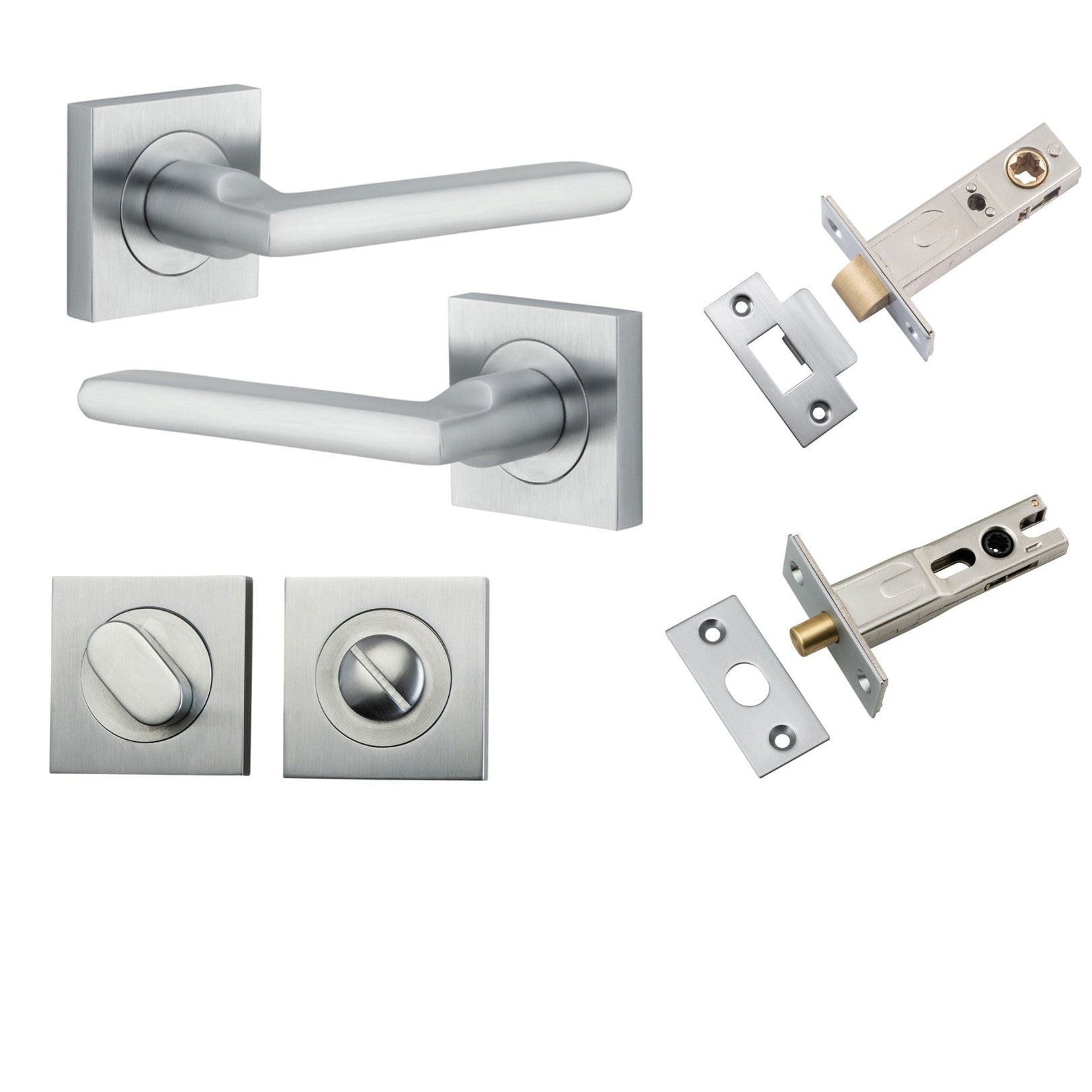 Included in Kit: Door Lever Baltimore Square Rose Pair Brushed Chrome H52xW52xP55mm Privacy Kit, Tube Latch Split Cam 'T' Striker Brushed Chrome Backset 60mm, Privacy Bolt Round Bolt Brushed Chrome Backset 60mm, Privacy Turn Oval Concealed Fix Square Brushed Chrome H52xW52xP23mm