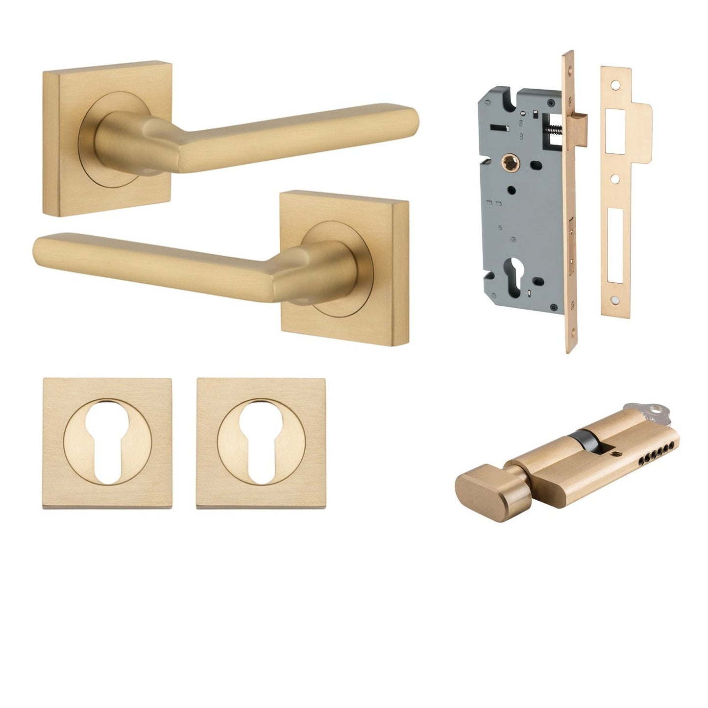 Included in Kit: Door Lever Baltimore Square Rose Pair Brushed Brass H52xW52xP58mm Entrance Kit, Mortice Lock Euro Brushed Brass CTC85mm Backset 60mm, Euro Cylinder Key Thumb 6 Pin Brushed Brass L70mm KA1, Escutcheon Euro Concealed Fix Square Pair Brushed Brass H52xW52xP10mm