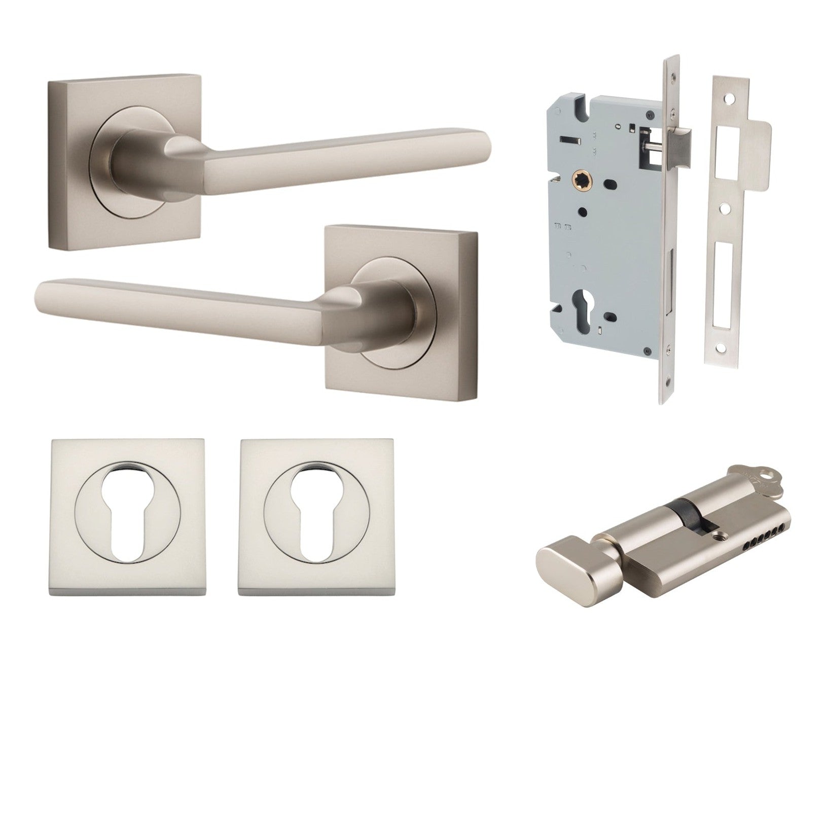 Included in Kit: Door Lever Baltimore Square Rose Pair Satin Nickel H52xW52xP55mm Entrance Kit, Mortice Lock Euro Satin Nickel CTC85mm Backset 60mm, Euro Cylinder Key Thumb 6 Pin Satin Nickel L70mm KA1, Escutcheon Euro Concealed Fix Square Pair Satin Nickel H52xW52xP10mm