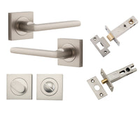 Included in Kit: Door Lever Baltimore Square Rose Pair Satin Nickel H52xW52xP55mm Privacy Kit, Tube Latch Split Cam 'T' Striker Satin Nickel Backset 60mm, Privacy Bolt Round Bolt Satin Nickel Backset 60mm, Privacy Turn Oval Concealed Fix Square Satin Nickel H52xW52xP23mm