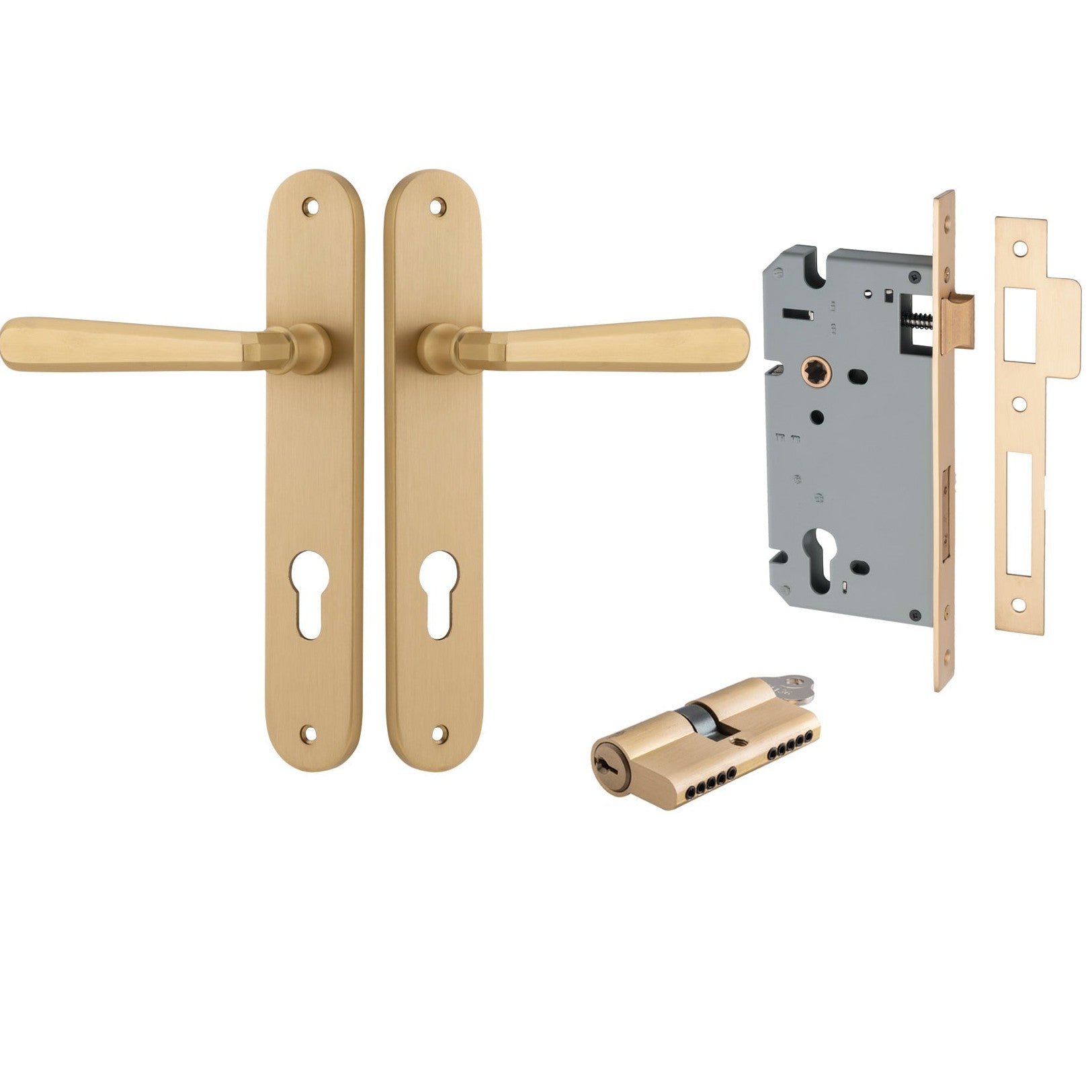 Included in Kit: Door Lever Copenhagen Oval Euro Pair Brushed Brass CTC85mm H240xW40xP61mm Entrance Kit, Mortice Lock Euro Brushed Brass CTC85mm Backset 60mm, Euro Cylinder Dual Function 5 Pin Brushed Brass L65mm KA1