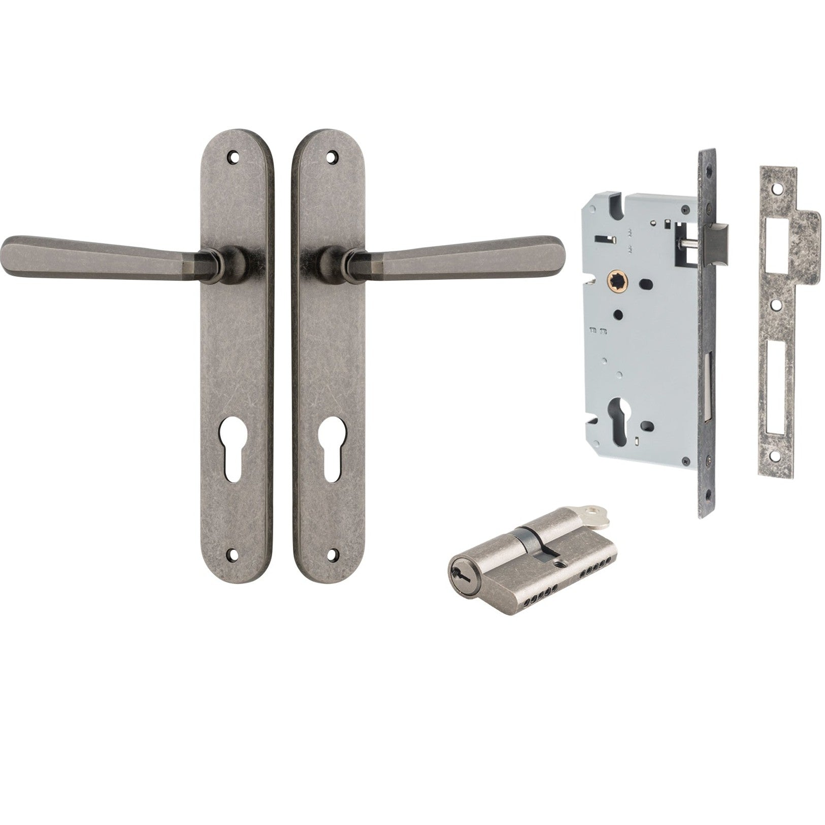 Included in Kit: Door Lever Copenhagen Oval Euro Pair Distressed Nickel CTC85mm H240xW40xP61mm Entrance Kit, Mortice Lock Euro Distressed Nickel CTC85mm Backset 60mm, Euro Cylinder Dual Function 5 Pin Distressed Nickel L65mm KA1