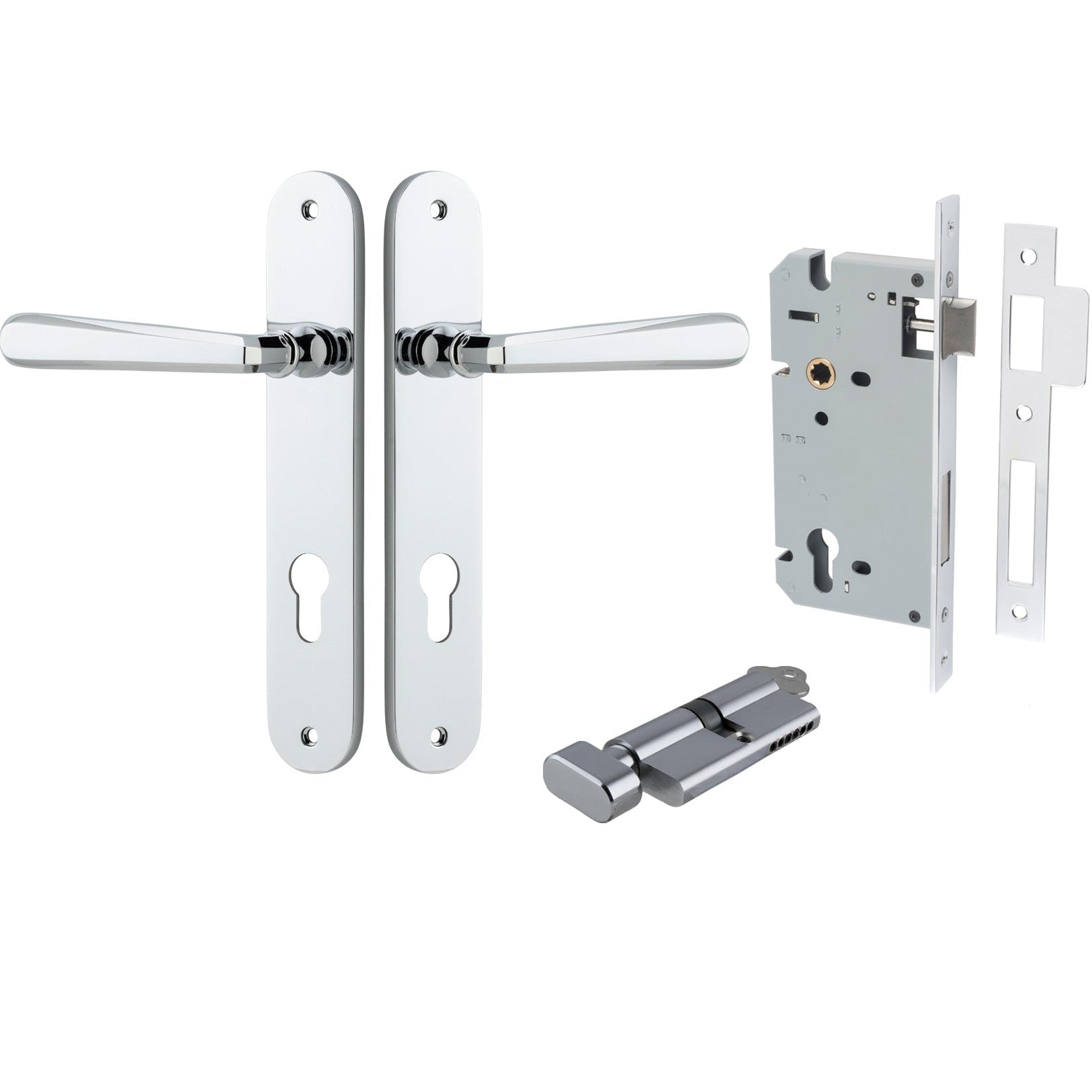 Included in Kit: Door Lever Copenhagen Oval Euro Pair Polished Chrome CTC85mm H240xW40xP61mm Entrance Kit, Mortice Lock Euro Polished Chrome CTC85mm Backset 60mm, Euro Cylinder Key Thumb 6 Pin Polished Chrome L70mm KA1