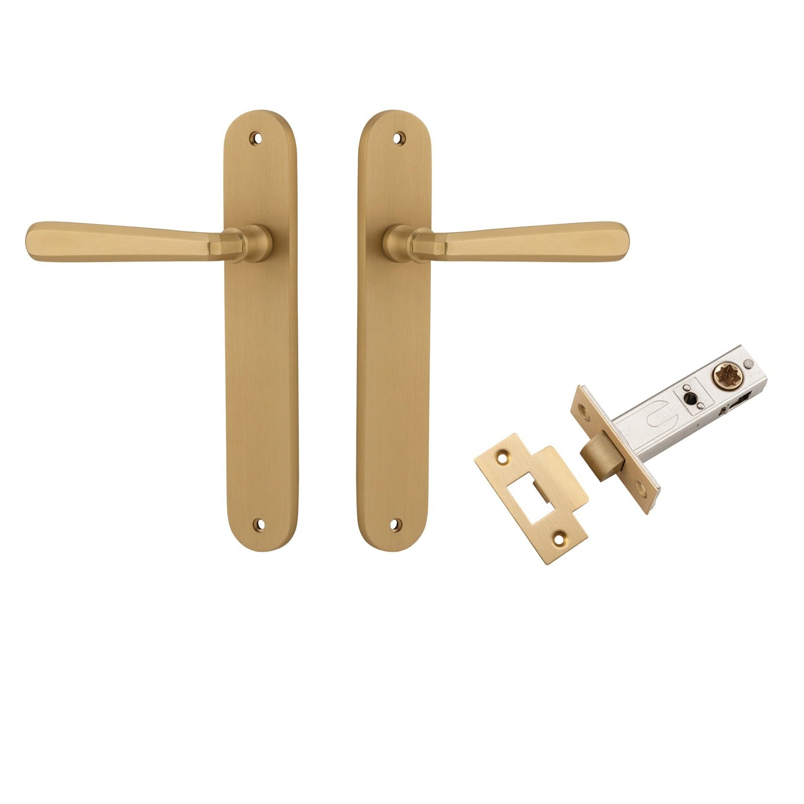 Included in Kit: Door Lever Copenhagen Oval Latch Pair Brushed Brass H240xW40xP61mm Passage Kit, Tube Latch Split Cam 'T' Striker Brushed Brass Backset 60mm