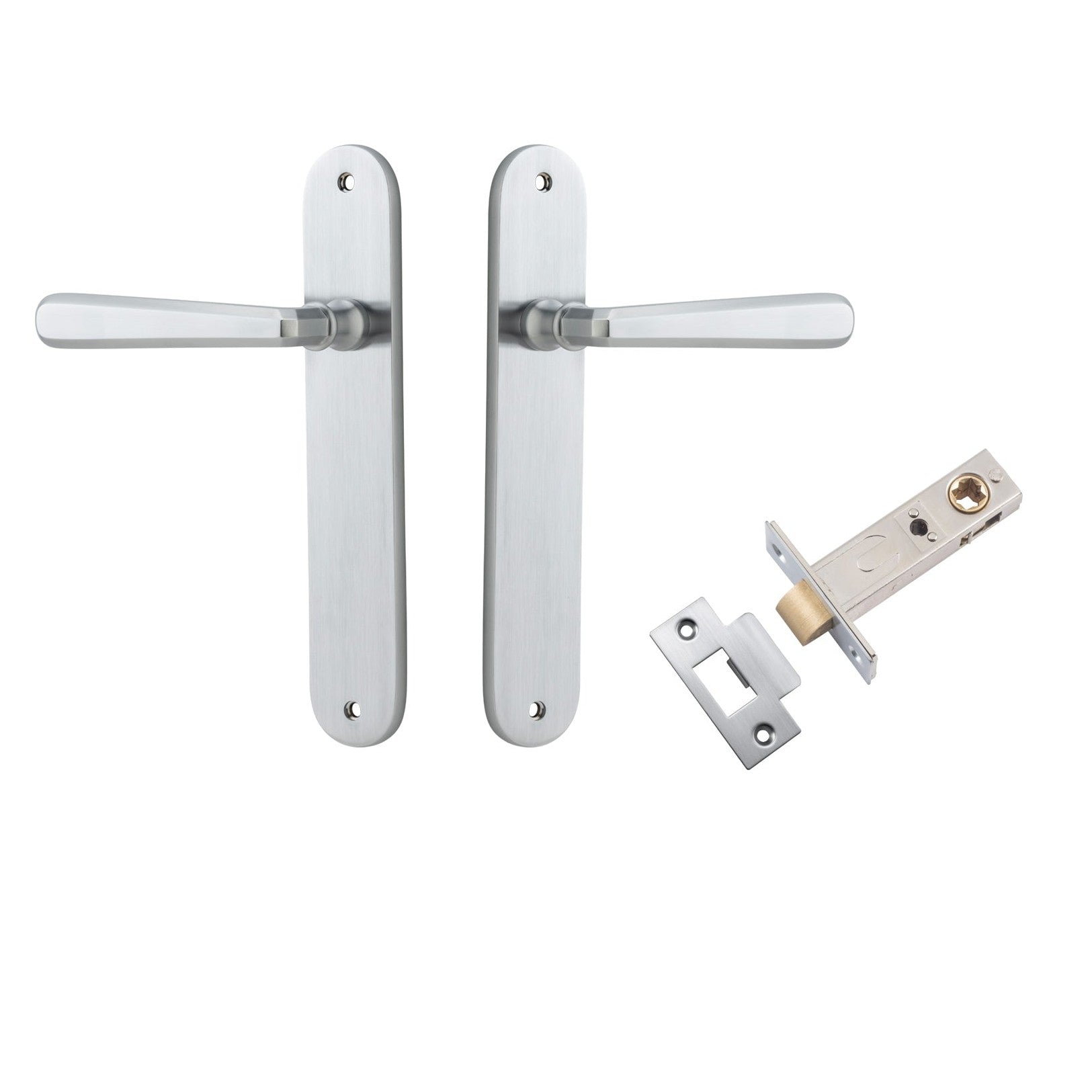 Included in Kit: Door Lever Copenhagen Oval Latch Pair Brushed Chrome H240xW40xP61mm Passage Kit, Tube Latch Split Cam 'T' Striker Brushed Chrome Backset 60mm