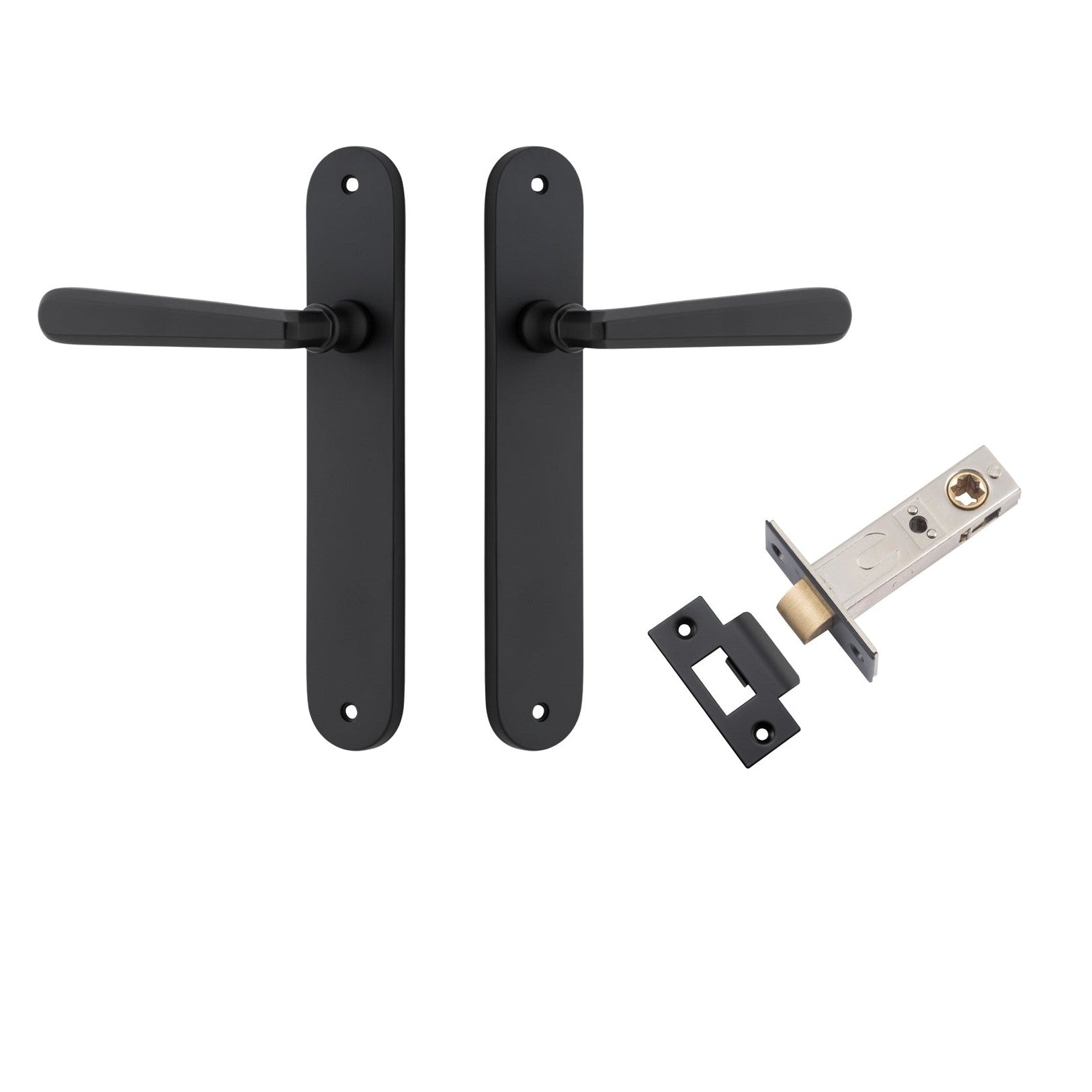 Included in Kit: Door Lever Copenhagen Oval Latch Pair Matt Black H240xW40xP61mm Passage Kit, Tube Latch Split Cam 'T' Striker Matt Black Backset 60mm