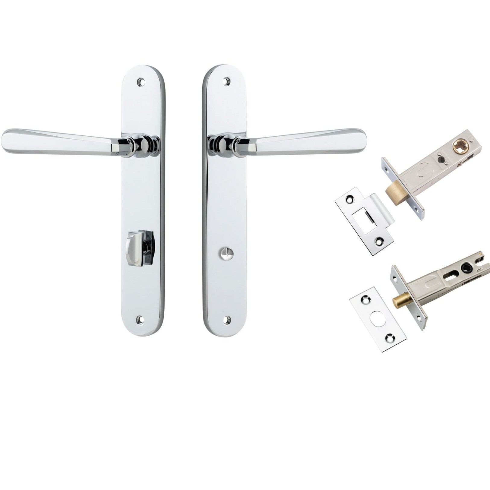 Included in Kit: Door Lever Copenhagen Oval Privacy Pair Polished Chrome CTC85mm H240xW40xP61mm Inbuilt Privacy Kit, Tube Latch Split Cam 'T' Striker Polished Chrome Backset 60mm, Privacy Bolt Round Bolt Polished Chrome Backset 60mm