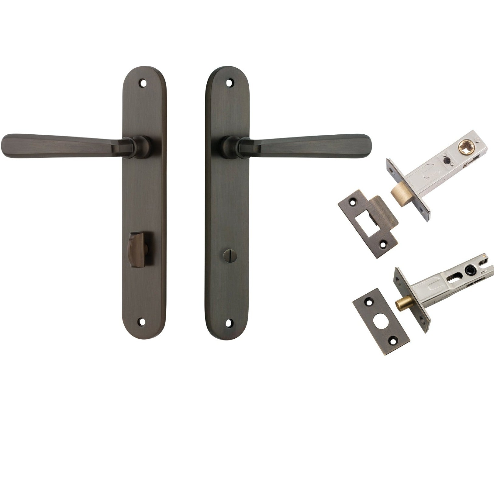Included in Kit: Door Lever Copenhagen Oval Privacy Pair Signature Brass CTC85mm H240xW40xP61mm Inbuilt Privacy Kit, Tube Latch Split Cam 'T' Striker Signature Brass Backset 60mm, Privacy Bolt Round Bolt Signature Brass Backset 60mm