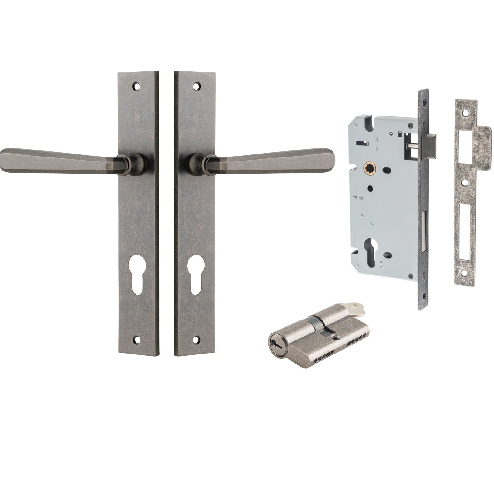 Included in Kit: Door Lever Copenhagen Rectangular Euro Pair Distressed Nickel CTC85mm H240xW38xP61mm Entrance Kit, Mortice Lock Euro Distressed Nickel CTC85mm Backset 60mm, Euro Cylinder Dual Function 5 Pin Distressed Nickel L65mm KA1