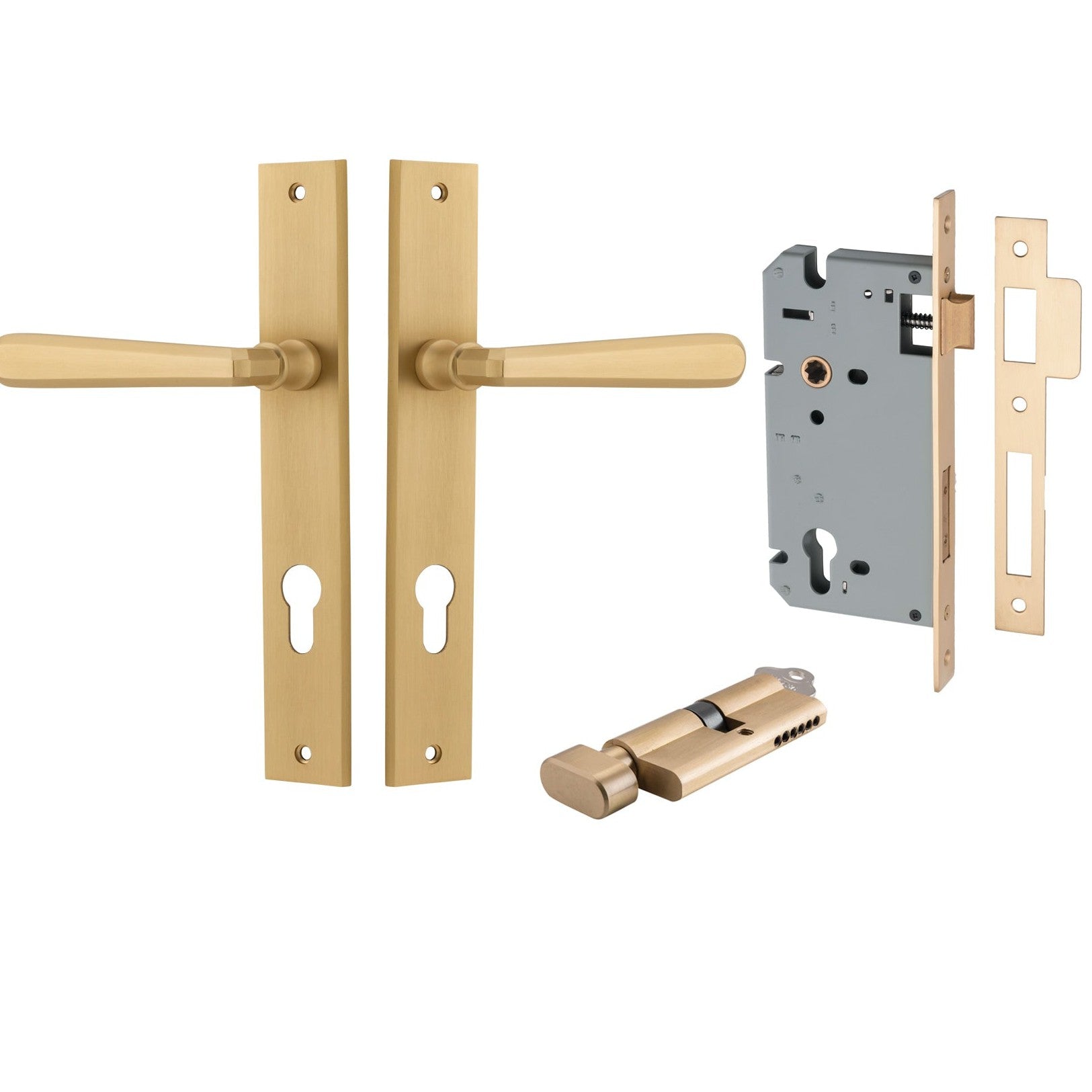 Included in Kit: Door Lever Copenhagen Rectangular Euro Pair Brushed Brass CTC85mm H240xW38xP61mm Entrance Kit, Mortice Lock Euro Brushed Brass CTC85mm Backset 60mm, Euro Cylinder Key Thumb 6 Pin Brushed Brass L70mm KA1