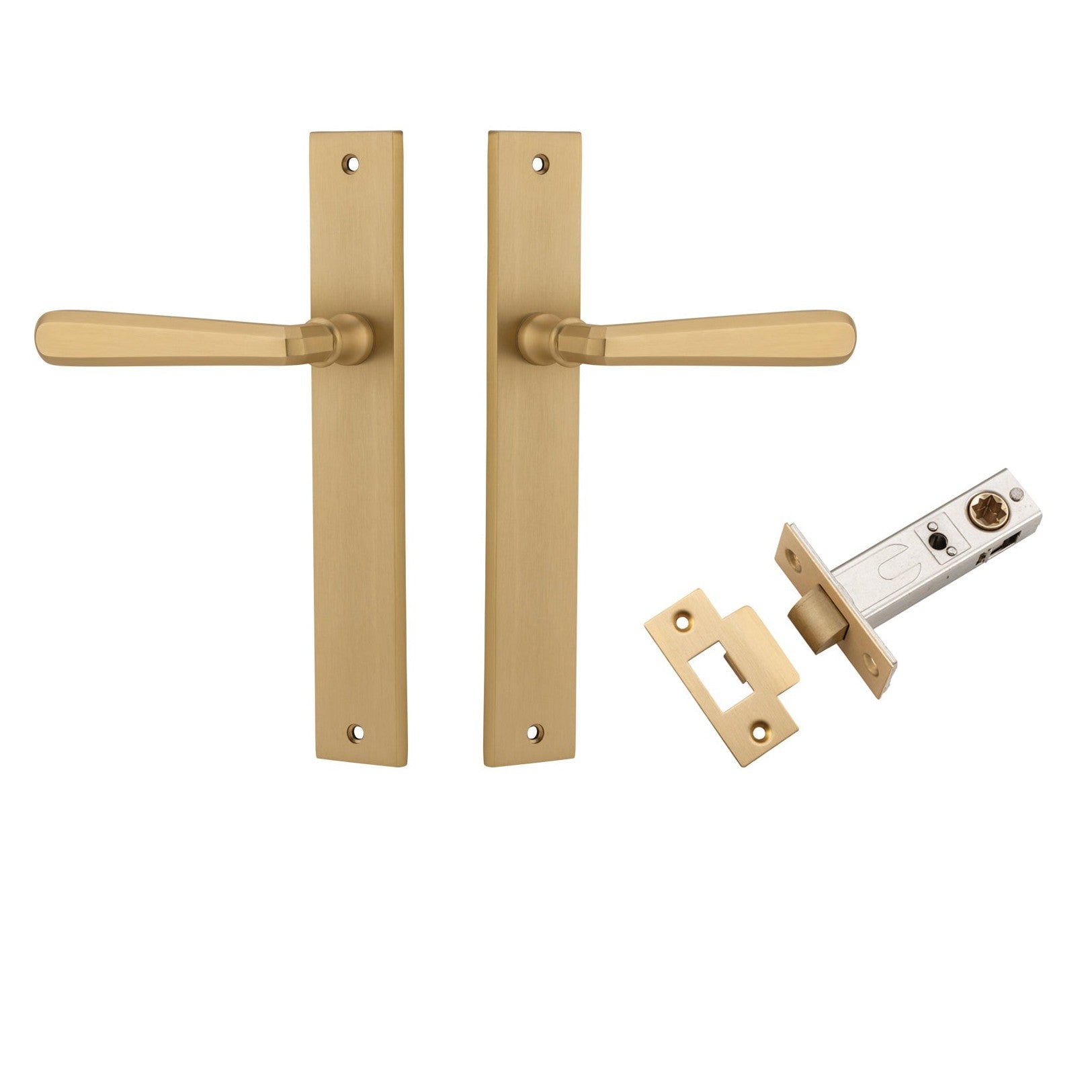 Included in Kit: Door Lever Copenhagen Rectangular Latch Pair Brushed Brass H240xW38xP61mm Passage Kit, Tube Latch Split Cam 'T' Striker Brushed Brass Backset 60mm