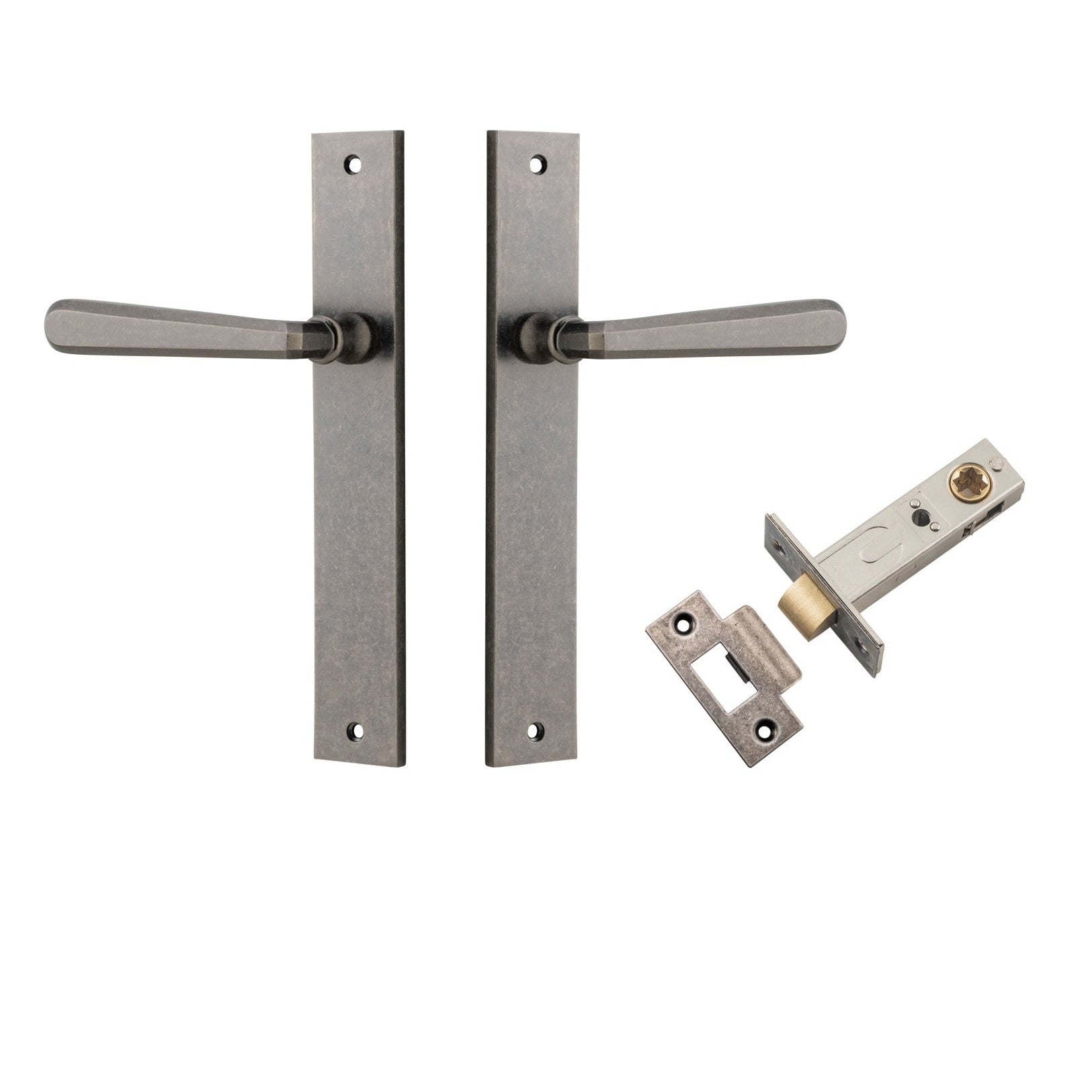 Included in Kit: Door Lever Copenhagen Rectangular Latch Pair Distressed Nickel H240xW38xP61mm Passage Kit, Tube Latch Split Cam 'T' Striker Distressed Nickel Backset 60mm