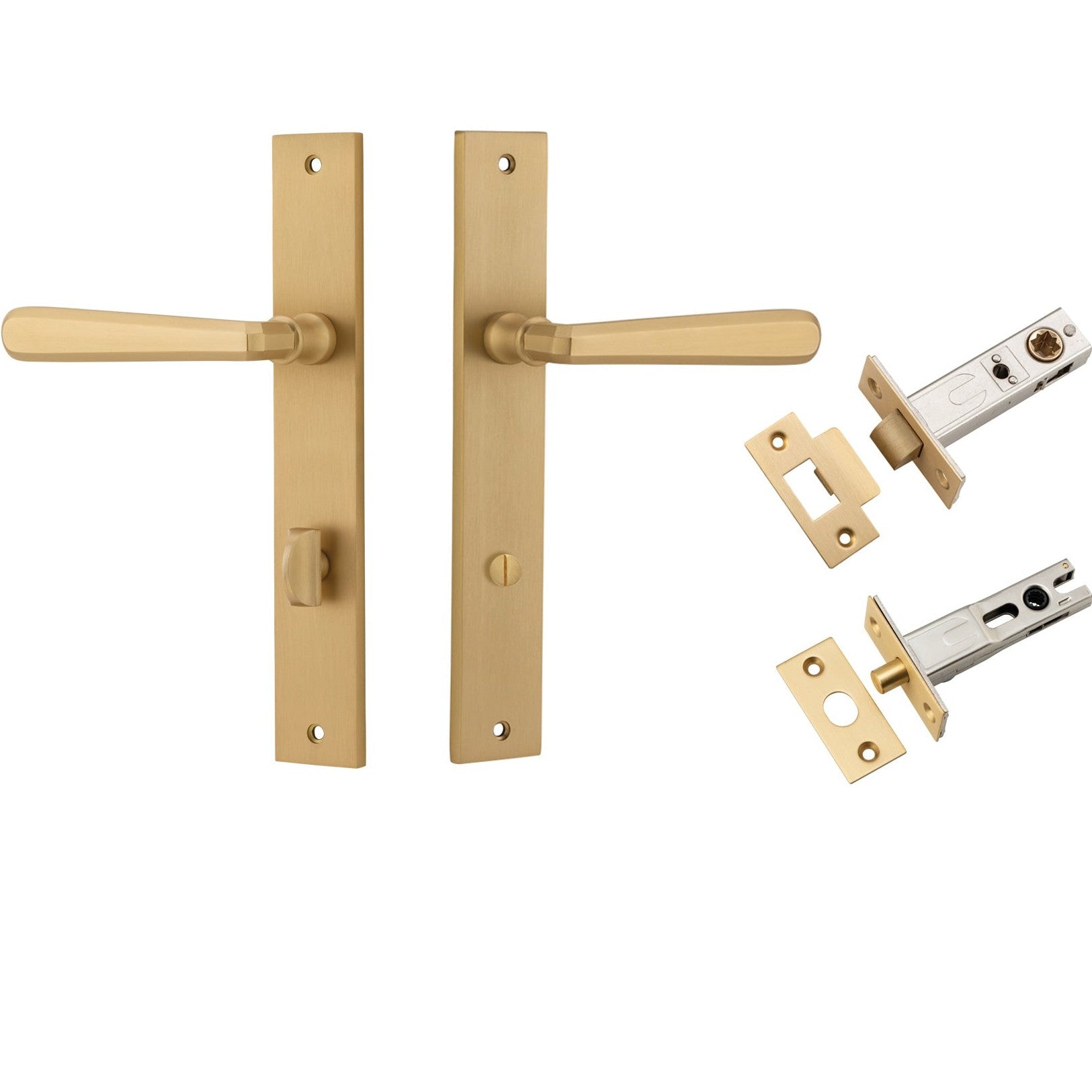 Included in Kit: Door Lever Copenhagen Rectangular Privacy Pair Brushed Brass CTC85mm H240xW38xP61mm Inbuilt Privacy Kit, Tube Latch Split Cam 'T' Striker Brushed Brass Backset 60mm, Privacy Bolt Round Bolt Brushed Brass Backset 60mm