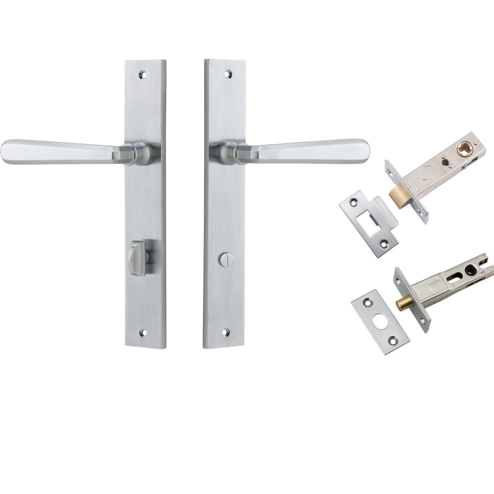 Included in Kit: Door Lever Copenhagen Rectangular Privacy Pair Brushed Chrome CTC85mm H240xW38xP61mm Inbuilt Privacy Kit, Tube Latch Split Cam 'T' Striker Brushed Chrome Backset 60mm, Privacy Bolt Round Bolt Brushed Chrome Backset 60mm