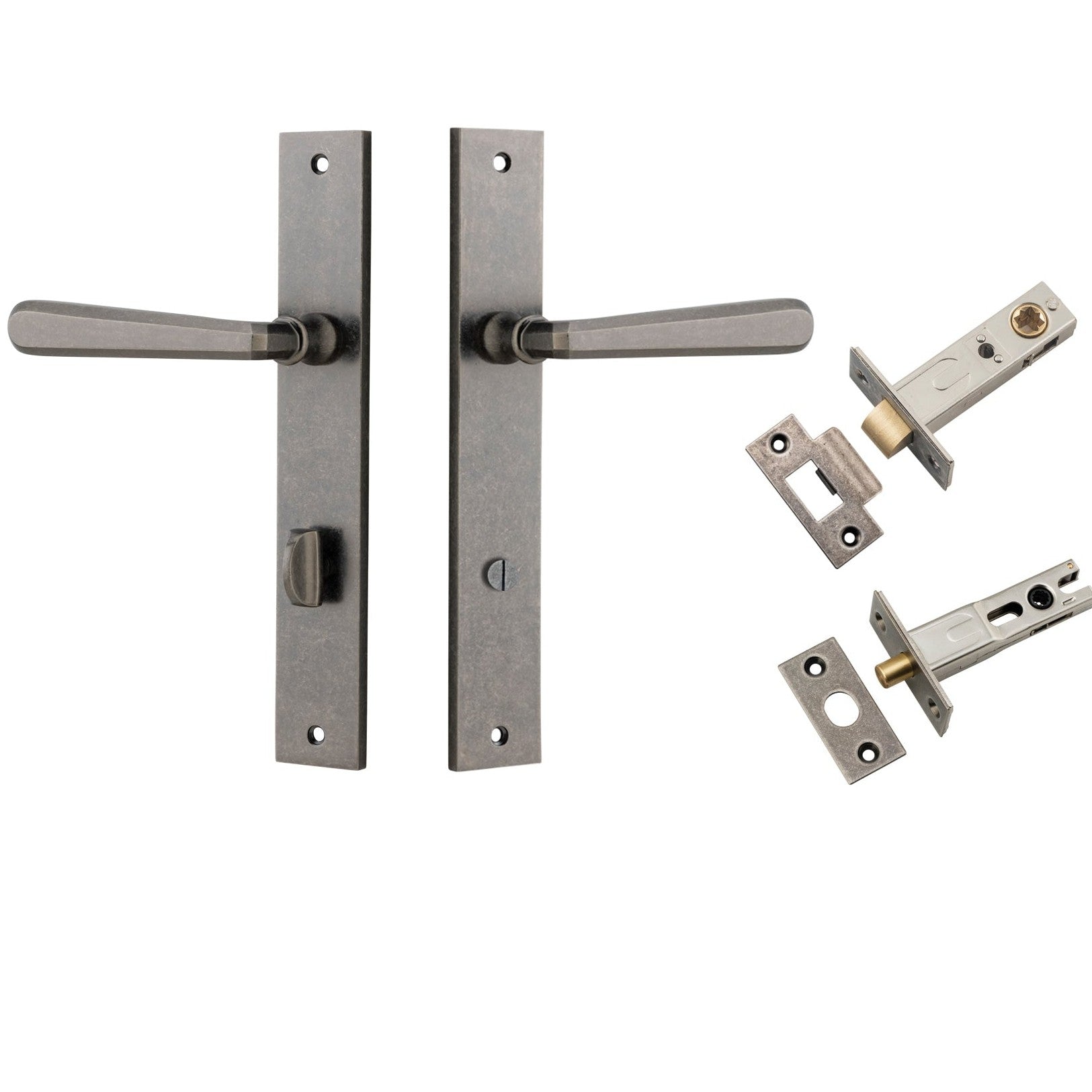 Included in Kit: Door Lever Copenhagen Rectangular Privacy Pair Distressed Nickel CTC85mm H240xW38xP61mm Inbuilt Privacy Kit, Tube Latch Split Cam 'T' Striker Distressed Nickel Backset 60mm, Privacy Bolt Round Bolt Distressed Nickel Backset 60mm