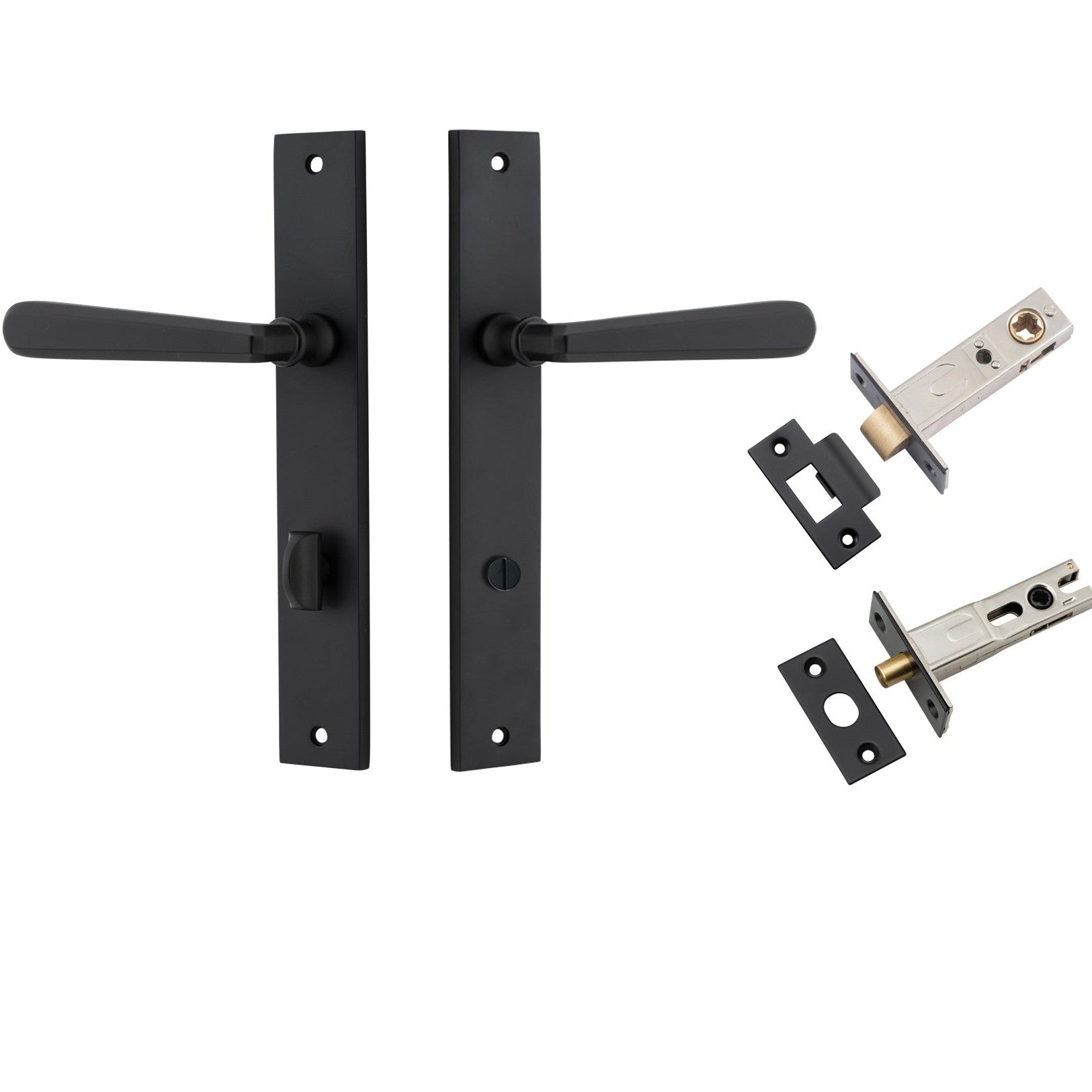 Included in Kit: Door Lever Copenhagen Rectangular Privacy Pair Matt Black CTC85mm H240xW38xP61mm Inbuilt Privacy Kit, Tube Latch Split Cam 'T' Striker Matt Black Backset 60mm, Privacy Bolt Round Bolt Matt Black Backset 60mm