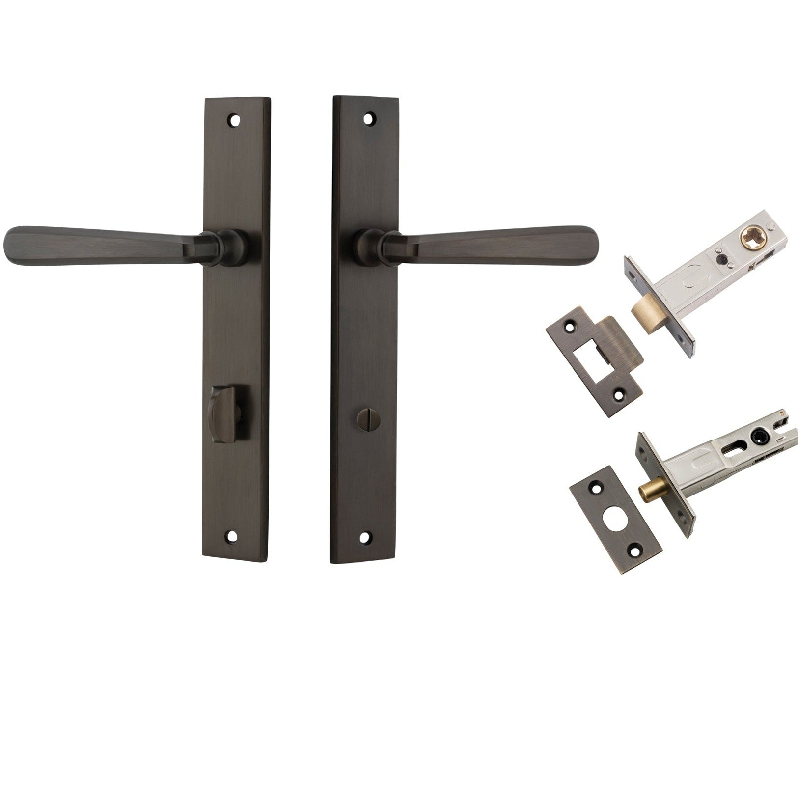 Included in Kit: Door Lever Copenhagen Rectangular Privacy Pair Signature Brass CTC85mm H240xW38xP61mm Inbuilt Privacy Kit, Tube Latch Split Cam 'T' Striker Signature Brass Backset 60mm, Privacy Bolt Round Bolt Signature Brass Backset 60mm