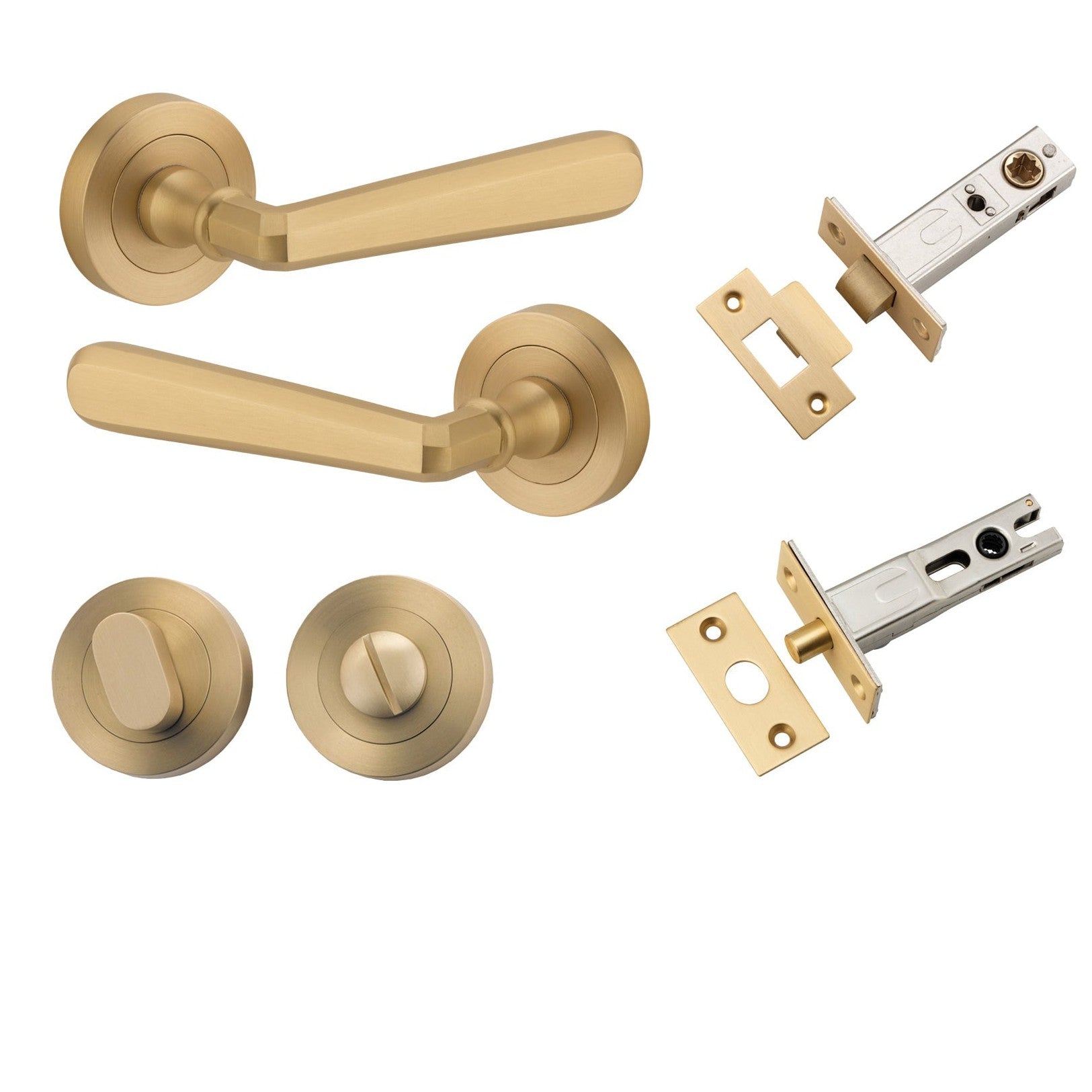 Included in Kit: Door Lever Copenhagen Round Rose Brushed Brass D52xP61mm Privacy Kit, Tube Latch Split Cam 'T' Striker Brushed Brass Backset 60mm, Privacy Bolt Round Bolt Brushed Brass Backset 60mm, Privacy Turn Oval Concealed Fix Round Brushed Brass D52xP23mm