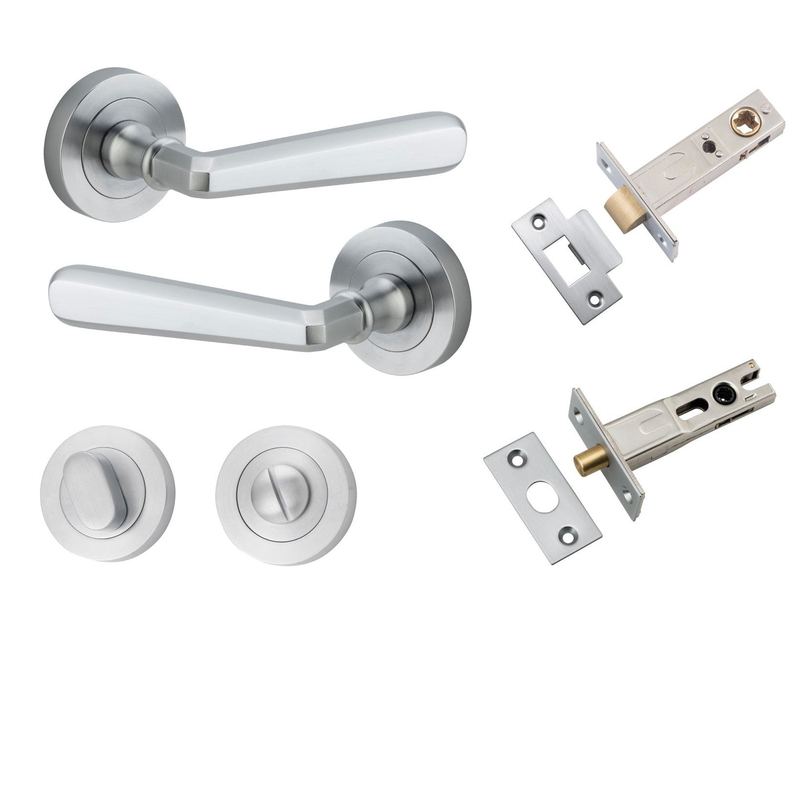 Included in Kit: Door Lever Copenhagen Round Rose Brushed Chrome D52xP61mm Privacy Kit, Tube Latch Split Cam 'T' Striker Brushed Chrome Backset 60mm, Privacy Bolt Round Bolt Brushed Chrome Backset 60mm, Privacy Turn Oval Concealed Fix Round Brushed Chrome D52xP23mm
