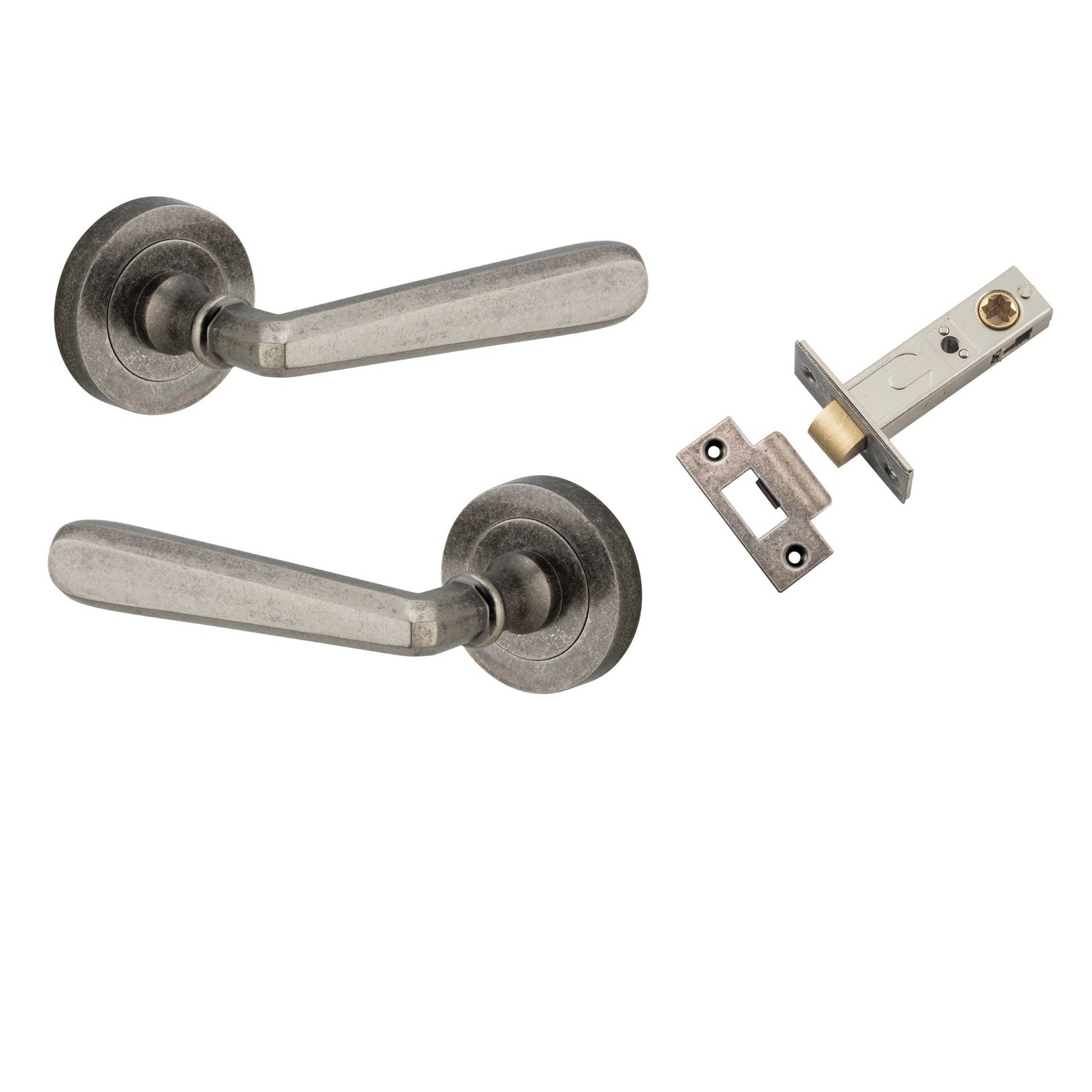 Included in Kit: Door Lever Copenhagen Round Rose Distressed Nickel D52xP61mm Passage Kit, Tube Latch Split Cam 'T' Striker Distressed Nickel Backset 60mm