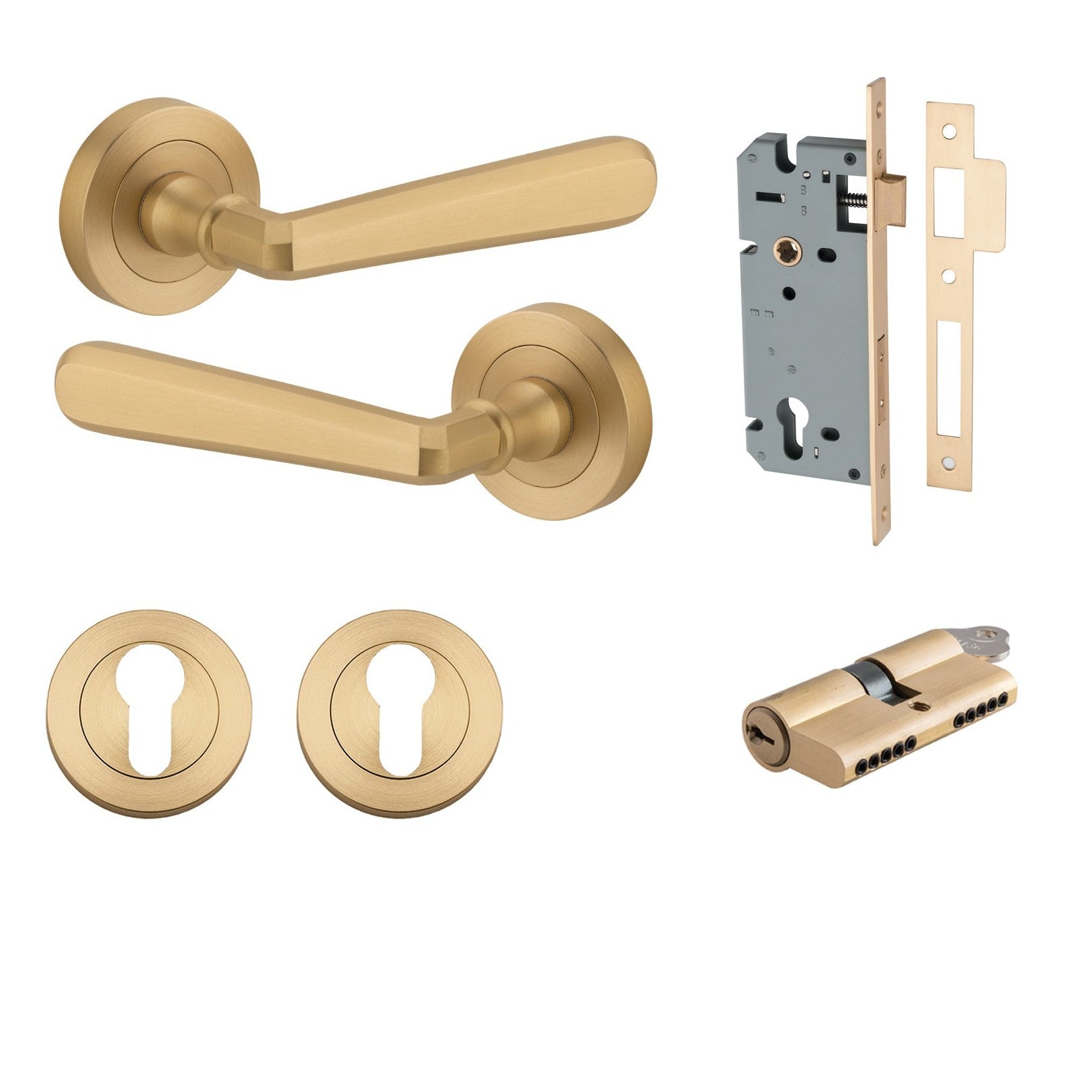Included in Kit: Door Lever Copenhagen Round Rose Brushed Brass D52xP61mm Entrance Kit, Mortice Lock Euro Brushed Brass CTC85mm Backset 60mm, Euro Cylinder Dual Function 5 Pin Brushed Brass L65mm KA1, Escutcheon Euro Concealed Fix Round Pair Brushed Brass D52xP10mm