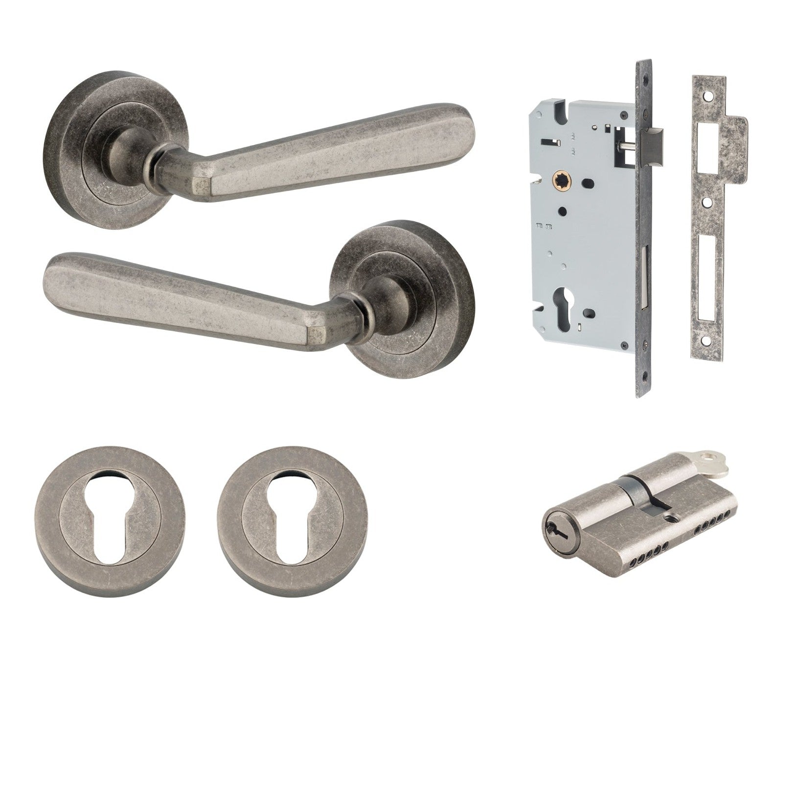 Included in Kit: Door Lever Copenhagen Round Rose Distressed Nickel D52xP61mm Entrance Kit, Mortice Lock Euro Distressed Nickel CTC85mm Backset 60mm, Euro Cylinder Dual Function 5 Pin Distressed Nickel L65mm KA1, Escutcheon Euro Concealed Fix Round Pair Distressed Nickel D52xP10mm