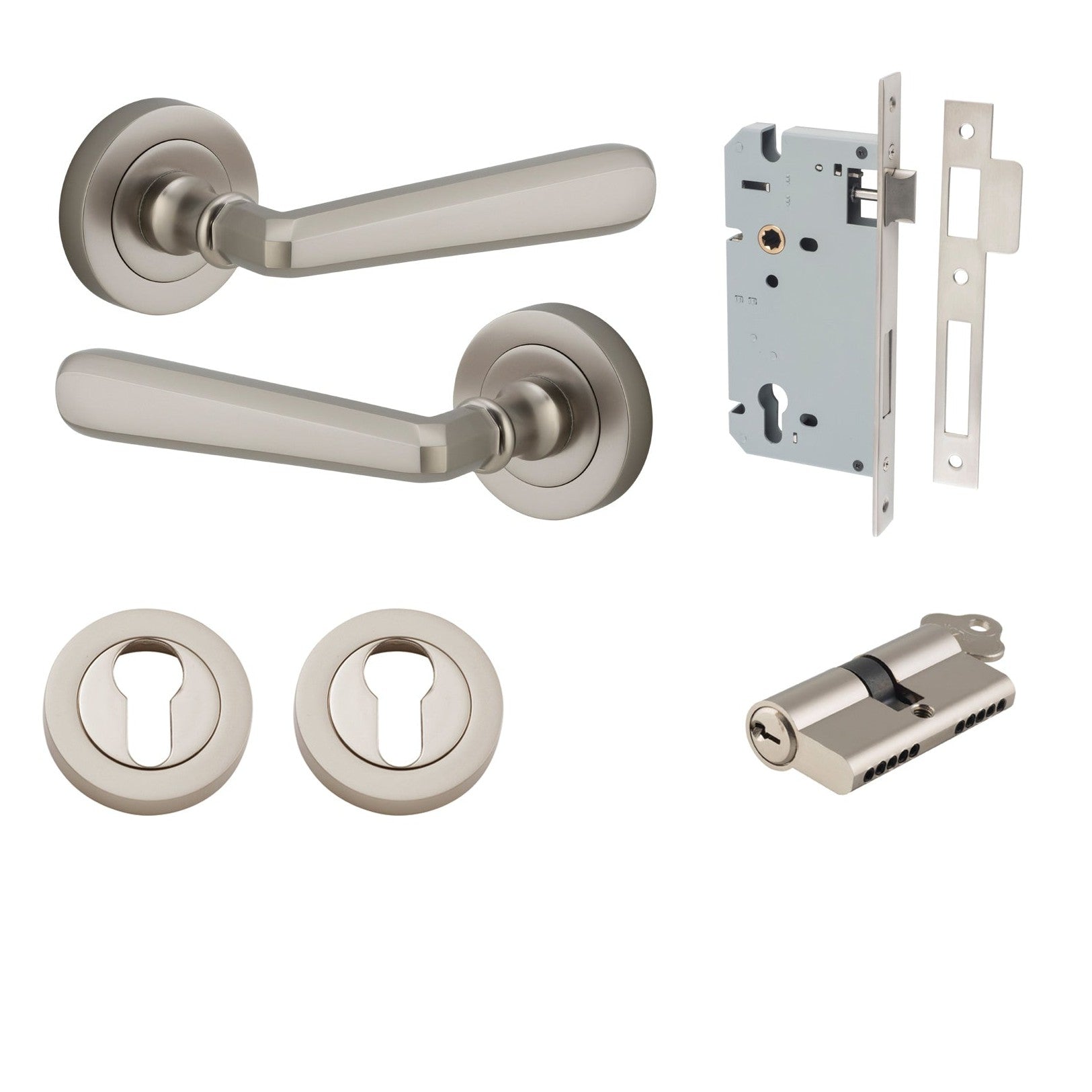 Included in Kit: Door Lever Copenhagen Round Rose Satin Nickel D52xP61mm Entrance Kit, Mortice Lock Euro Satin Nickel CTC85mm Backset 60mm, Euro Cylinder Dual Function 5 Pin Satin Nickel L65mm KA1, Escutcheon Euro Concealed Fix Round Pair Satin Nickel D52xP10mm