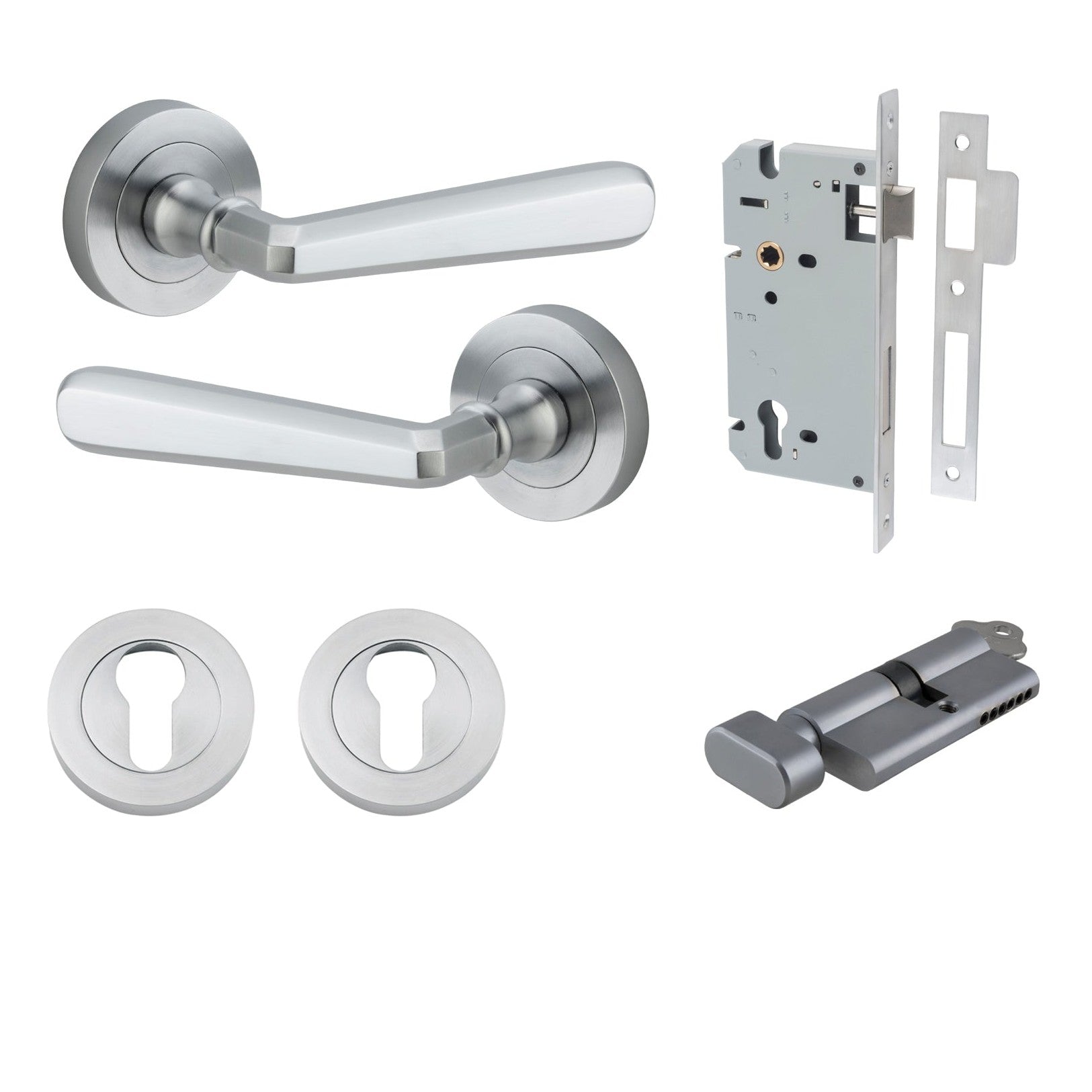 Included in Kit: Door Lever Copenhagen Round Rose Brushed Chrome D52xP61mm Entrance Kit, Mortice Lock Euro Brushed Chrome CTC85mm Backset 60mm, Euro Cylinder Key Thumb 6 Pin Brushed Chrome L70mm KA1, Escutcheon Euro Concealed Fix Round Pair Brushed Chrome D52xP10mm