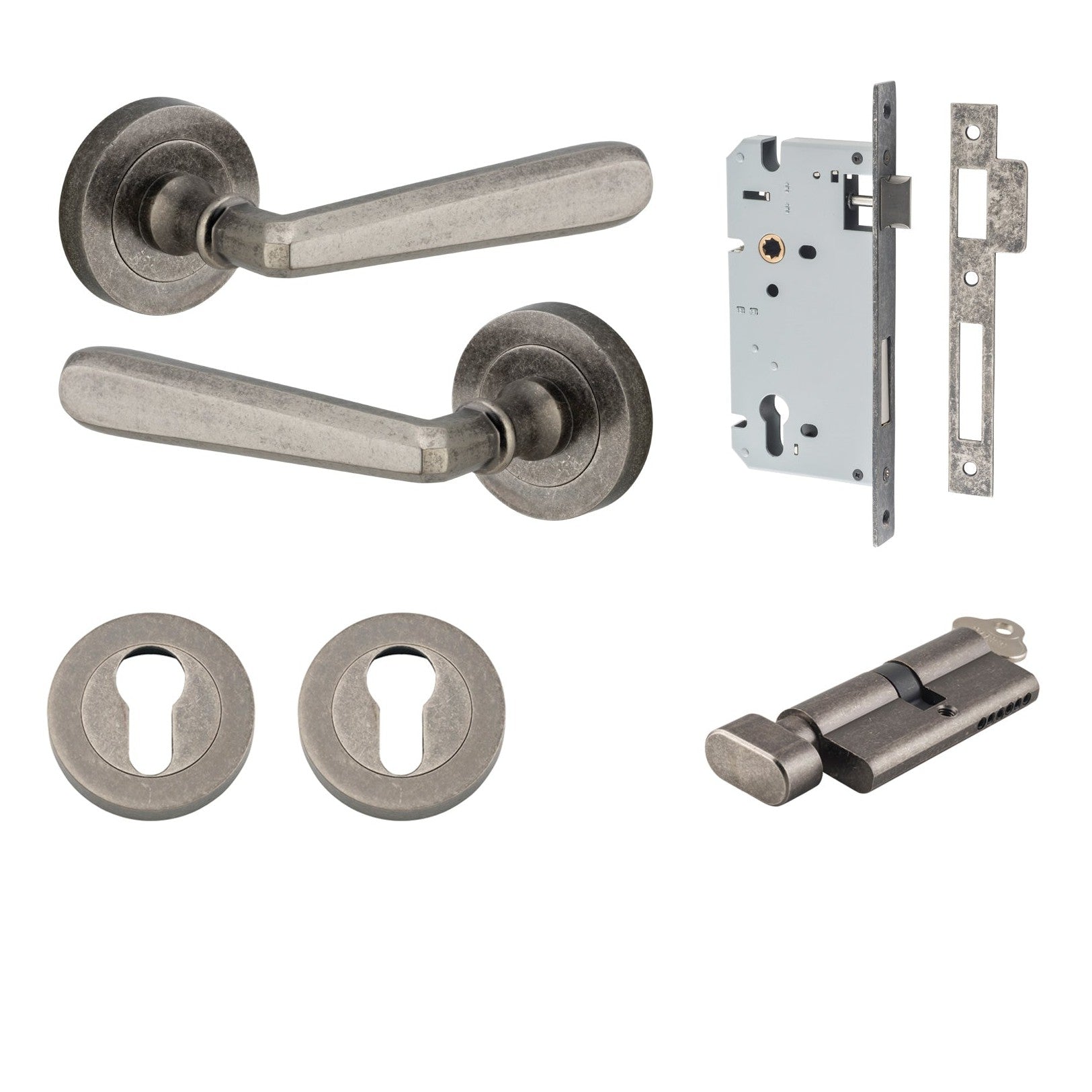 Included in Kit: Door Lever Copenhagen Round Rose Distressed Nickel D52xP61mm Entrance Kit, Mortice Lock Euro Distressed Nickel CTC85mm Backset 60mm, Euro Cylinder Key Thumb 6 Pin Distressed Nickel L70mm KA1, Escutcheon Euro Concealed Fix Round Pair Distressed Nickel D52xP10mm