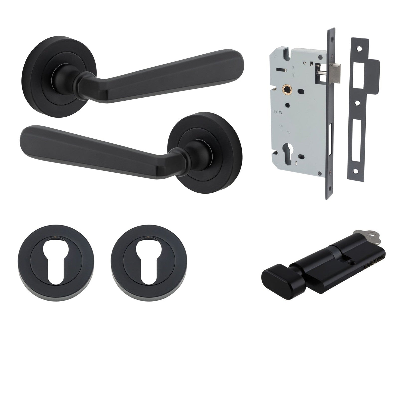 Included in Kit: Door Lever Copenhagen Round Rose Matt Black D52xP61mm Entrance Kit, Mortice Lock Euro Matt Black CTC85mm Backset 60mm, Euro Cylinder Key Thumb 6 Pin Matt Black L70mm KA1, Escutcheon Euro Concealed Fix Round Pair Matt Black D52xP10mm