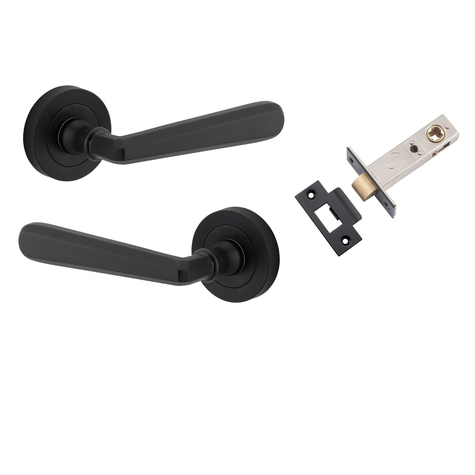 Included in Kit: Door Lever Copenhagen Round Rose Matt Black D52xP61mm Passage Kit, Tube Latch Split Cam 'T' Striker Matt Black Backset 60mm