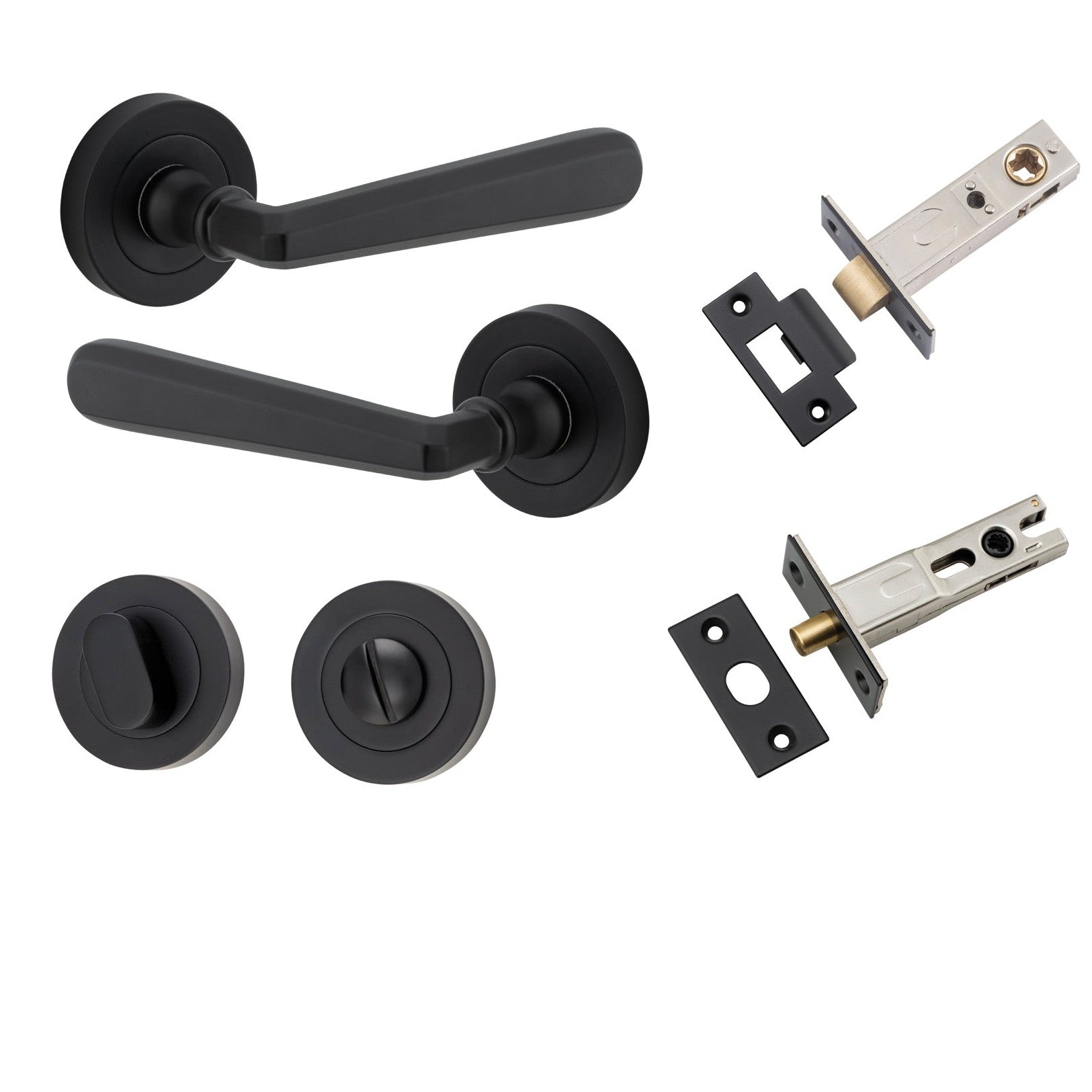 Included in Kit: Door Lever Copenhagen Round Rose Matt Black D52xP61mm Privacy Kit, Tube Latch Split Cam 'T' Striker Matt Black Backset 60mm, Privacy Bolt Round Bolt Matt Black Backset 60mm, Privacy Turn Oval Concealed Fix Round Matt Black D52xP23mm