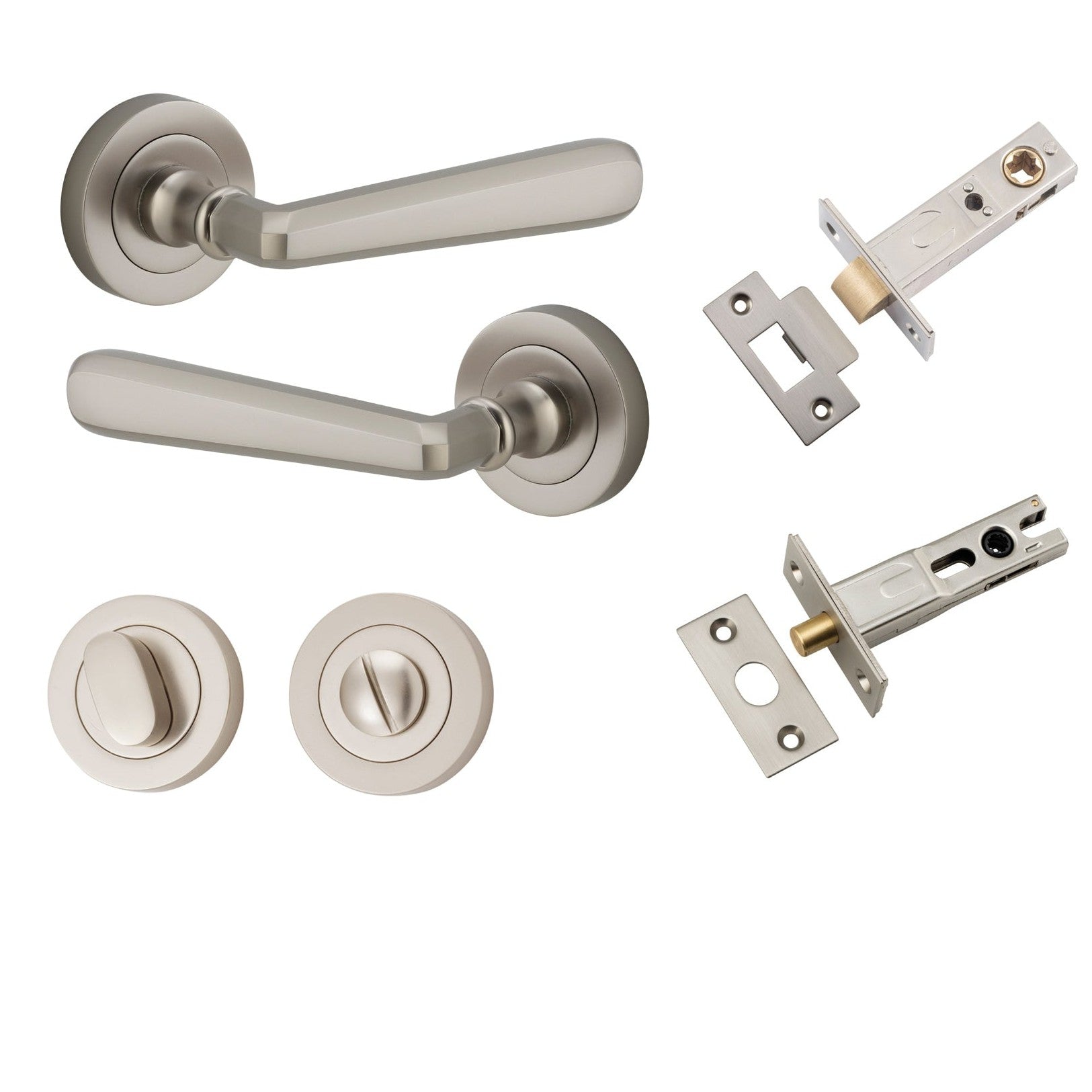 Included in Kit: Door Lever Copenhagen Round Rose Satin Nickel D52xP61mm Privacy Kit, Tube Latch Split Cam 'T' Striker Satin Nickel Backset 60mm, Privacy Bolt Round Bolt Satin Nickel Backset 60mm, Privacy Turn Oval Concealed Fix Round Satin Nickel D52xP23mm