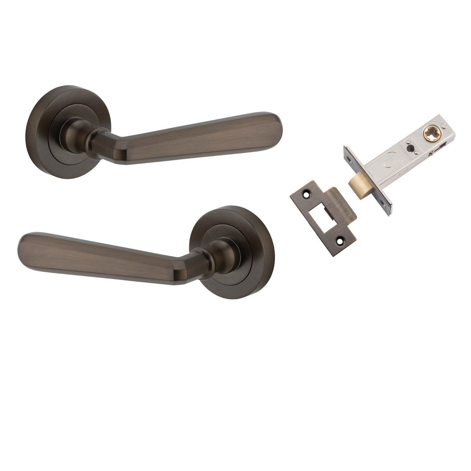 Included in Kit: Door Lever Copenhagen Round Rose Signature Brass D52xP61mm Passage Kit, Tube Latch Split Cam 'T' Striker Signature Brass Backset 60mm