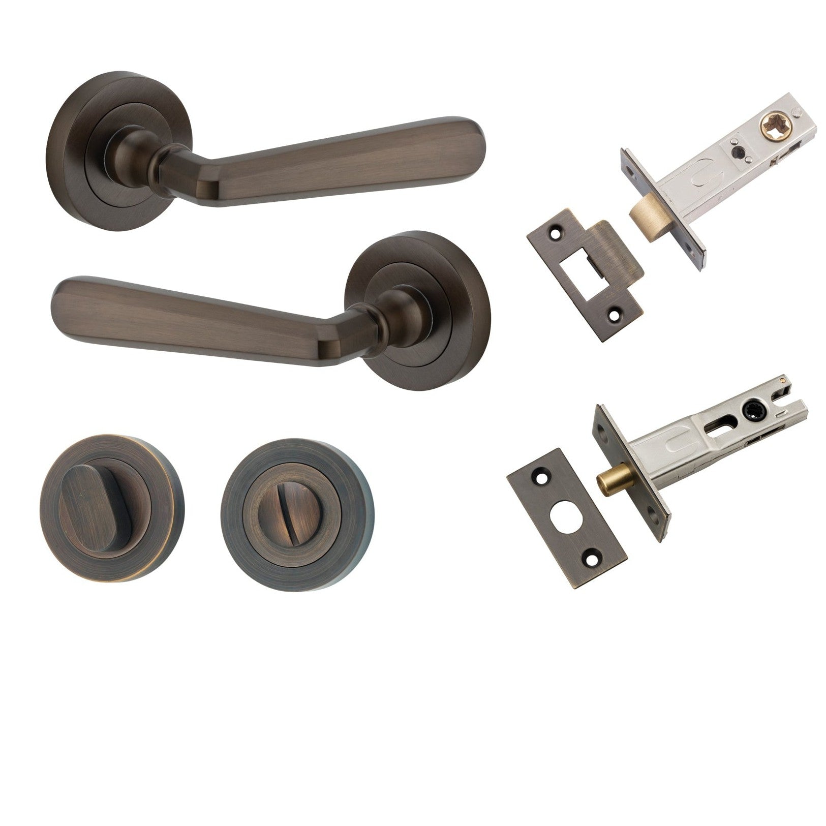 Included in Kit: Door Lever Copenhagen Round Rose Signature Brass D52xP61mm Privacy Kit, Tube Latch Split Cam 'T' Striker Signature Brass Backset 60mm, Privacy Bolt Round Bolt Signature Brass Backset 60mm, Privacy Turn Oval Concealed Fix Round Signature Brass D52xP23mm