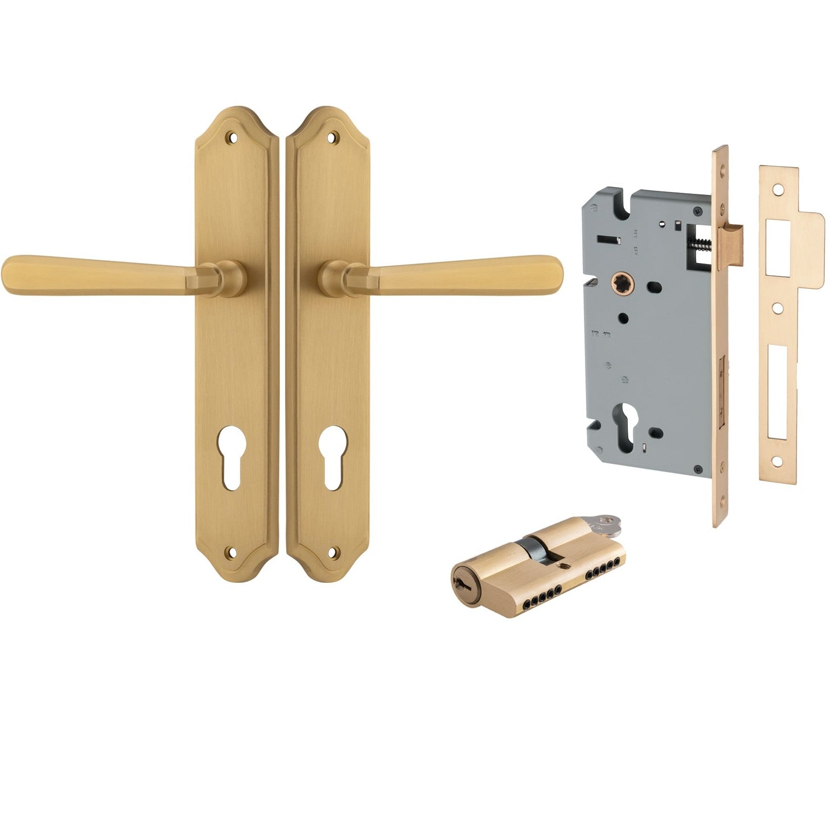 Included in Kit: Door Lever Copenhagen Shouldered Euro Pair Brushed Brass CTC85mm H250xW48xP61mm Entrance Kit, Mortice Lock Euro Brushed Brass CTC85mm Backset 60mm, Euro Cylinder Dual Function 5 Pin Brushed Brass L65mm KA1