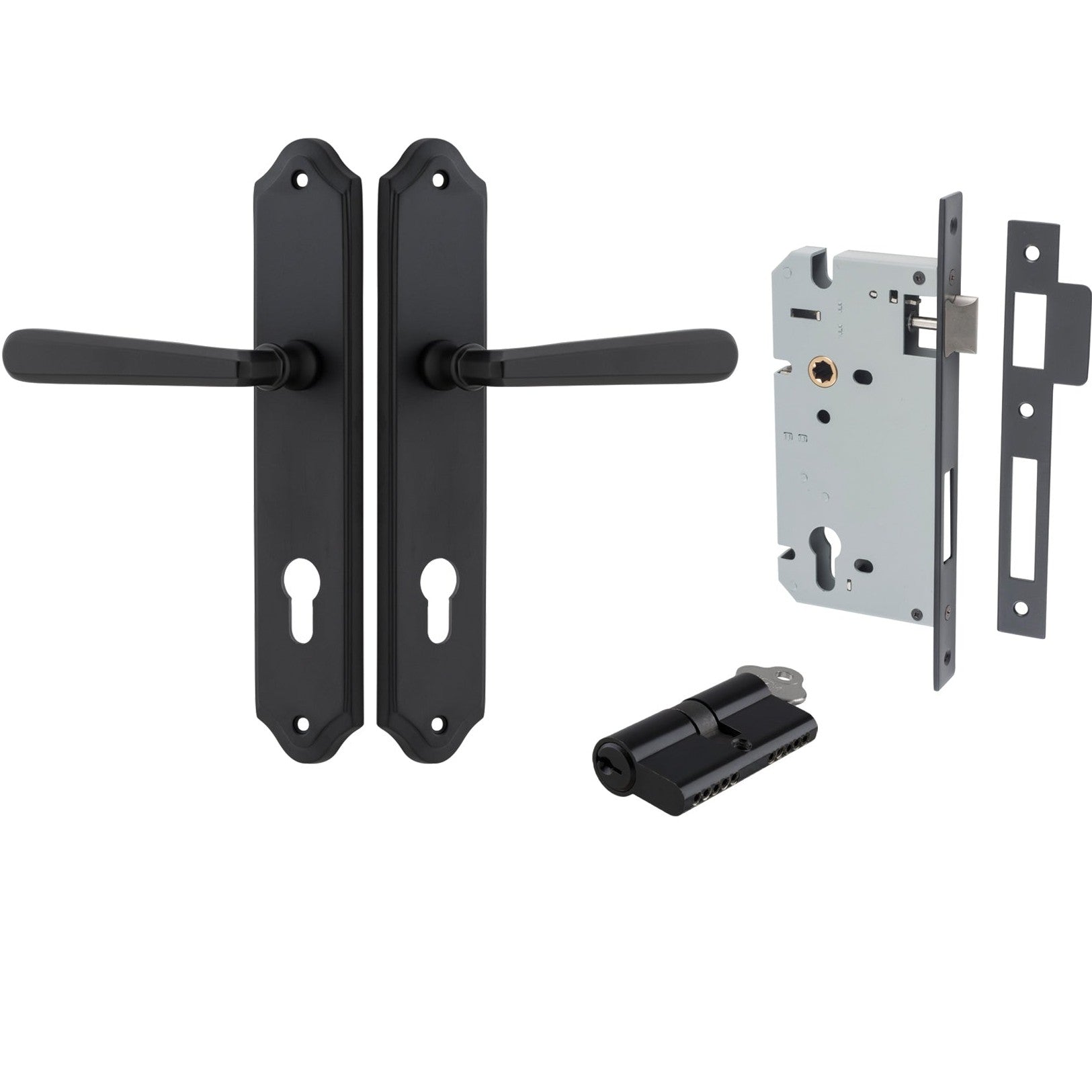 Included in Kit: Door Lever Copenhagen Shouldered Euro Pair Matt Black CTC85mm H250xW48xP61mm Entrance Kit, Mortice Lock Euro Matt Black CTC85mm Backset 60mm, Euro Cylinder Dual Function 5 Pin Matt Black L65mm KA1