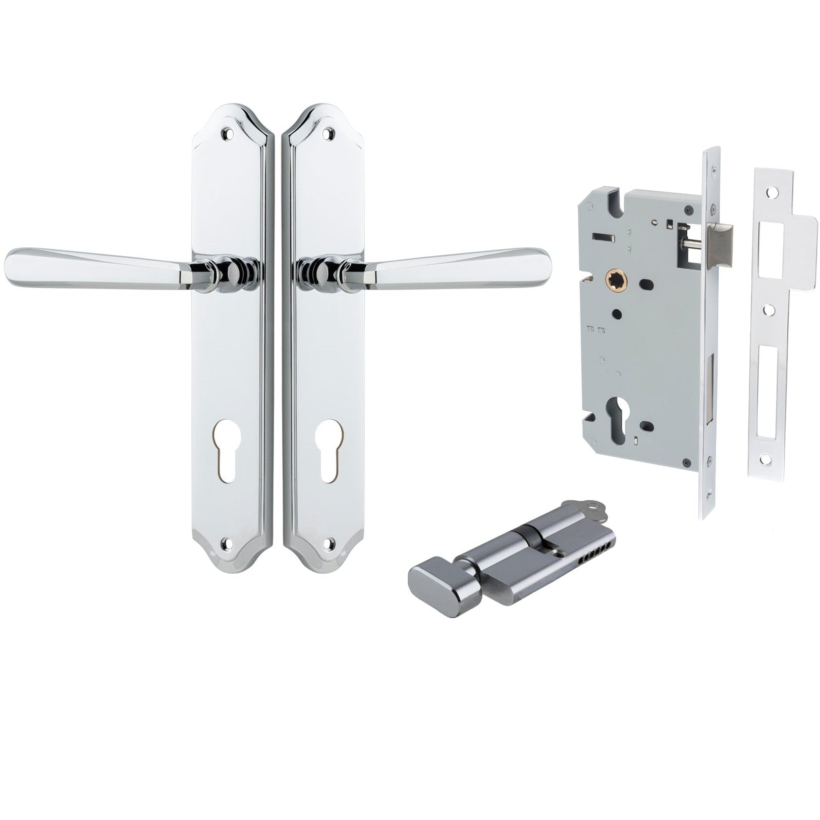 Included in Kit: Door Lever Copenhagen Shouldered Euro Pair Polished Chrome CTC85mm H250xW48xP61mm Entrance Kit, Mortice Lock Euro Polished Chrome CTC85mm Backset 60mm, Euro Cylinder Key Thumb 6 Pin Polished Chrome L70mm KA1