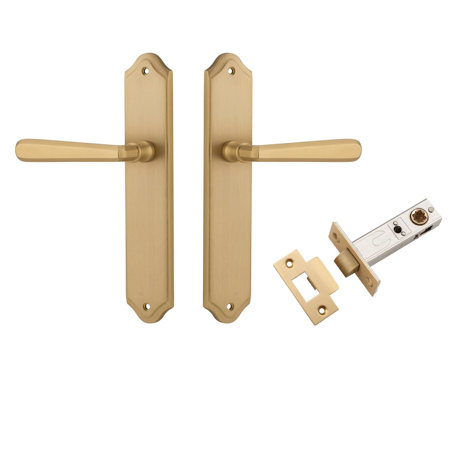 Included in Kit: Door Lever Copenhagen Shouldered Latch Pair Brushed Brass H250xW48xP61mm Passage Kit, Tube Latch Split Cam 'T' Striker Brushed Brass Backset 60mm