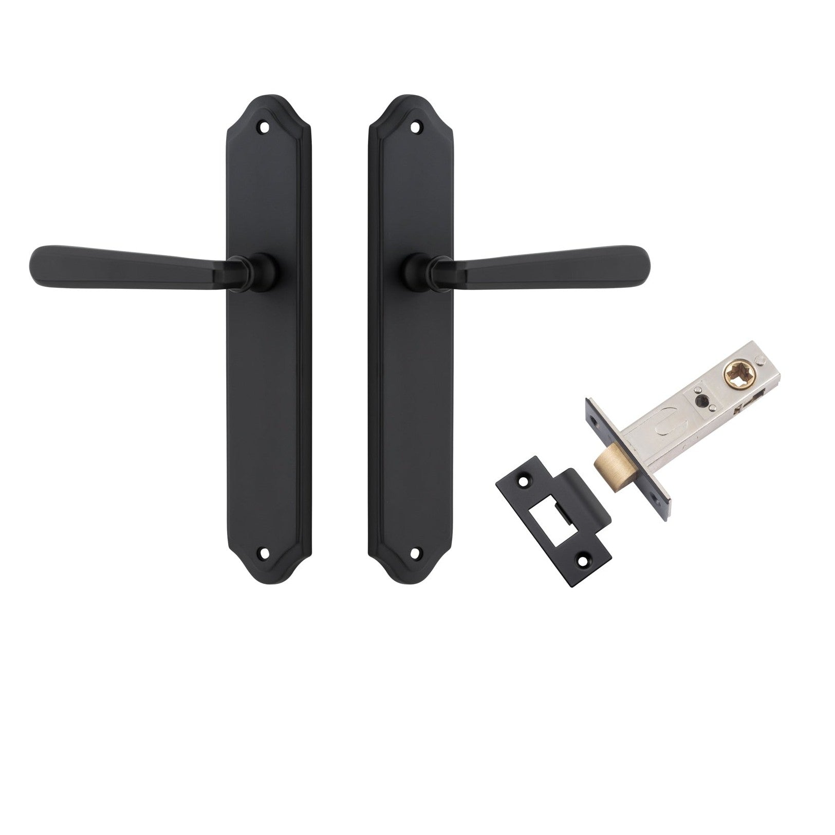Included in Kit: Door Lever Copenhagen Shouldered Latch Pair Matt Black H250xW48xP61mm Passage Kit, Tube Latch Split Cam 'T' Striker Matt Black Backset 60mm