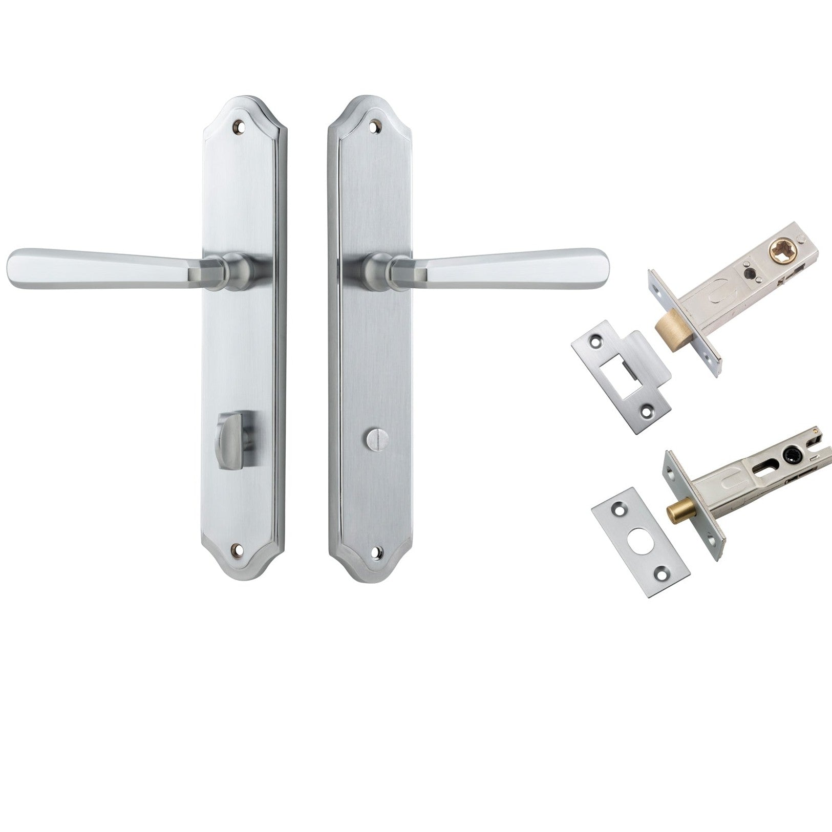 Included in Kit: Door Lever Copenhagen Shouldered Privacy Pair Brushed Chrome CTC85mm H250xW48xP61mm Inbuilt Privacy Kit, Tube Latch Split Cam 'T' Striker Brushed Chrome Backset 60mm, Privacy Bolt Round Bolt Brushed Chrome Backset 60mm