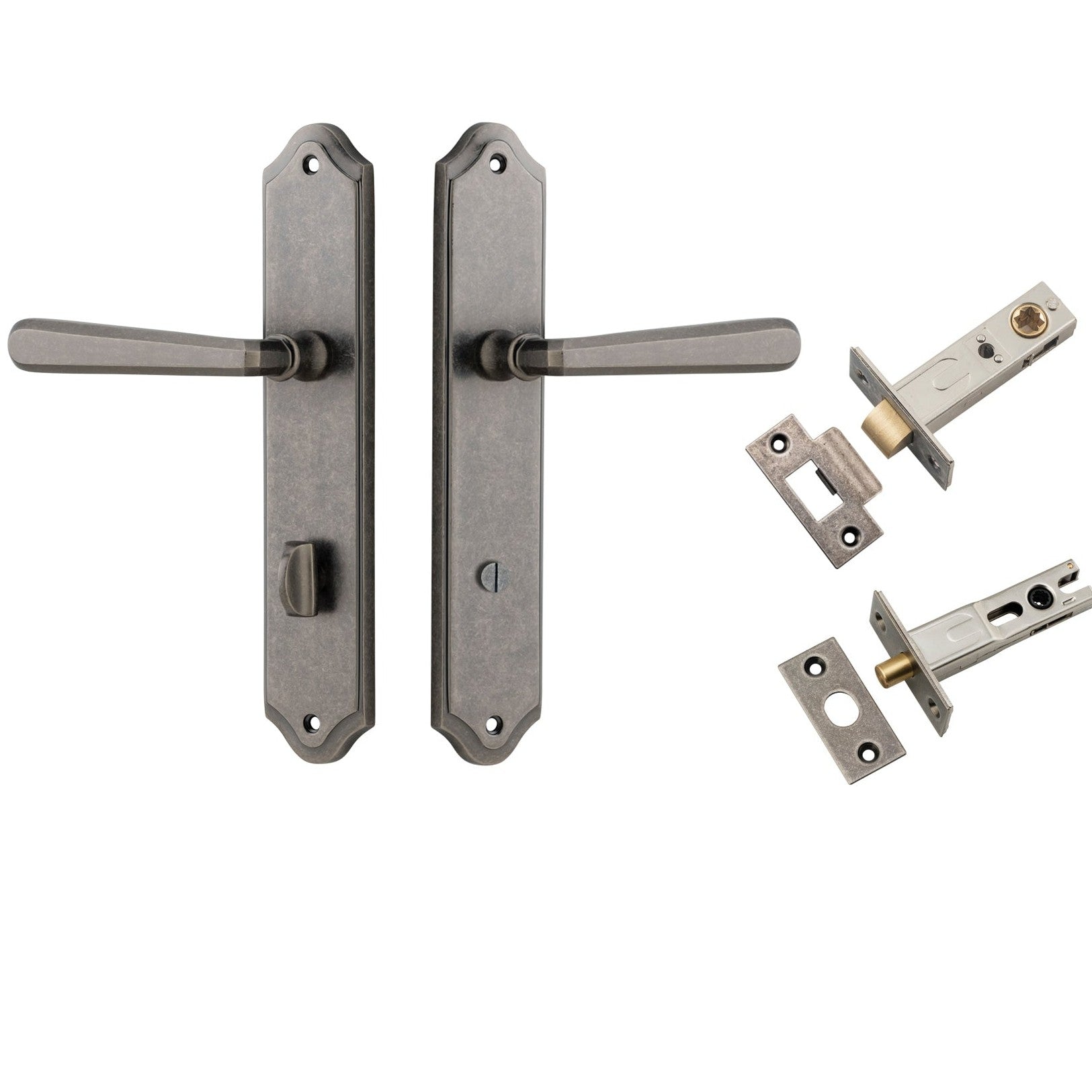 Included in Kit: Door Lever Copenhagen Shouldered Privacy Pair Distressed Nickel CTC85mm H250xW48xP61mm Inbuilt Privacy Kit, Tube Latch Split Cam 'T' Striker Distressed Nickel Backset 60mm, Privacy Bolt Round Bolt Distressed Nickel Backset 60mm