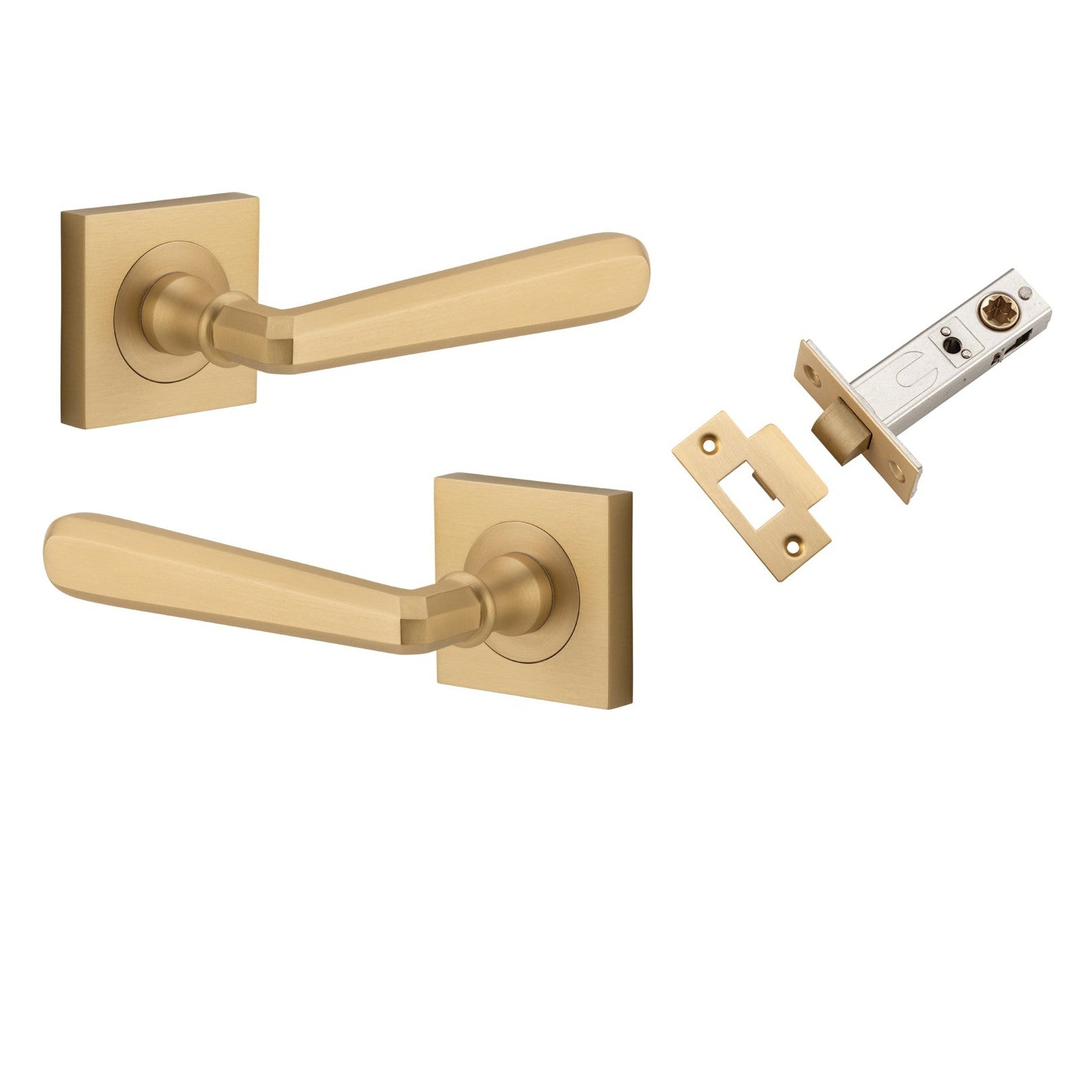 Included in Kit: Door Lever Copenhagen Square Rose Brushed Brass H52xW52xP61mm Passage Kit, Tube Latch Split Cam 'T' Striker Brushed Brass Backset 60mm