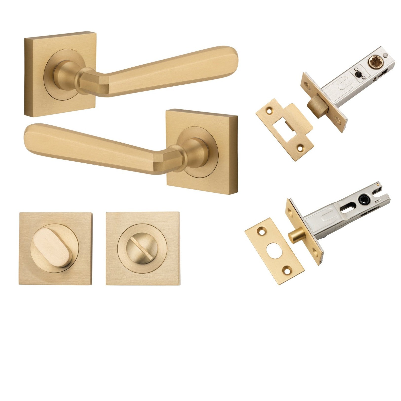 Included in Kit: Door Lever Copenhagen Square Rose Brushed Brass H52xW52xP61mm Privacy Kit, Tube Latch Split Cam 'T' Striker Brushed Brass Backset 60mm, Privacy Bolt Round Bolt Brushed Brass Backset 60mm, Privacy Turn Oval Concealed Fix Square Brushed Brass H52xW52xP23mm