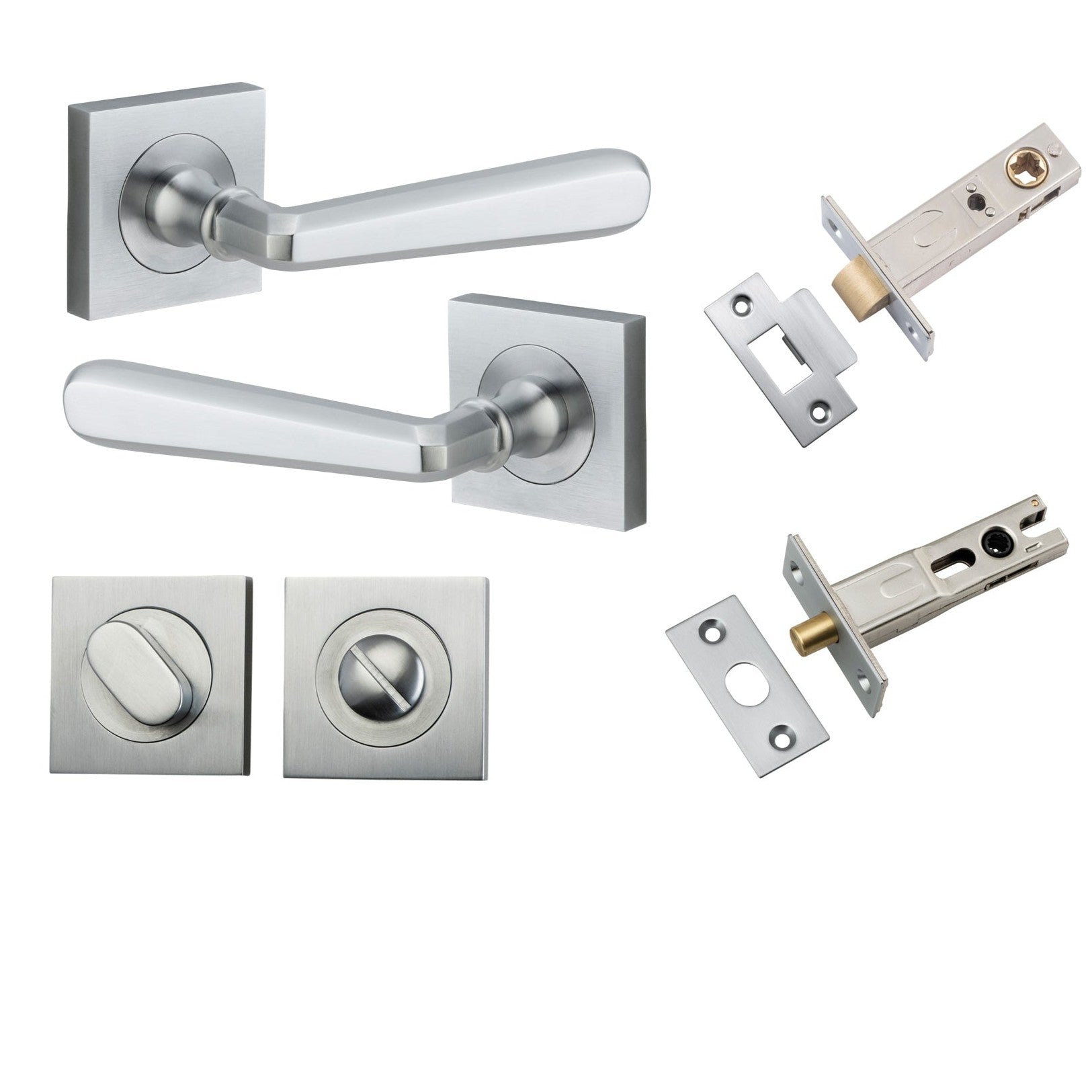 Included in Kit: Door Lever Copenhagen Square Rose Brushed Chrome H52xW52xP61mm Privacy Kit, Tube Latch Split Cam 'T' Striker Brushed Chrome Backset 60mm, Privacy Bolt Round Bolt Brushed Chrome Backset 60mm, Privacy Turn Oval Concealed Fix Square Brushed Chrome H52xW52xP23mm
