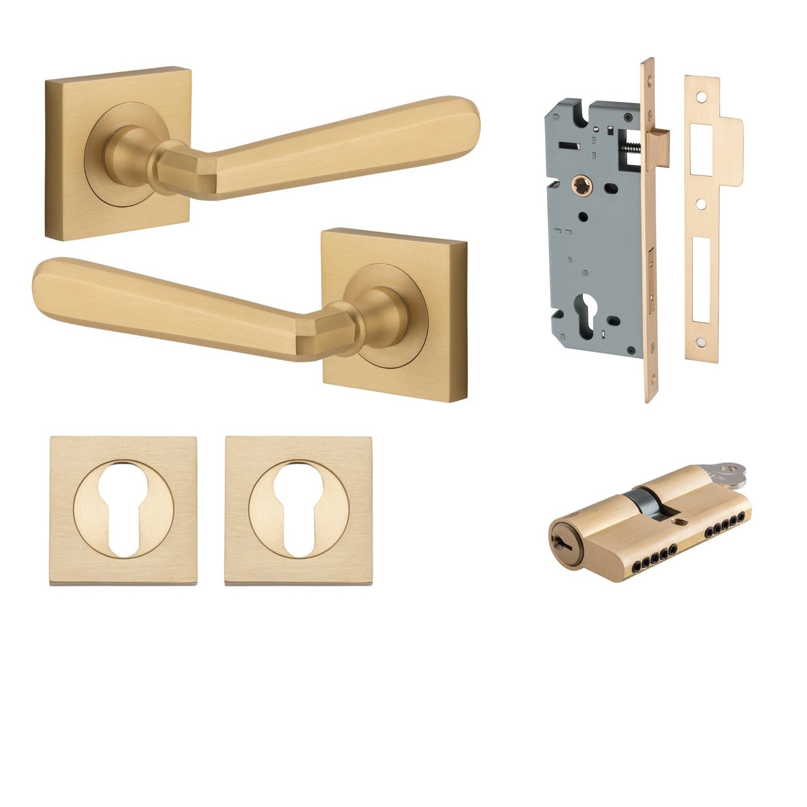 Included in Kit: Door Lever Copenhagen Square Rose Brushed Brass H52xW52xP61mm Entrance Kit, Mortice Lock Euro Brushed Brass CTC85mm Backset 60mm, Euro Cylinder Dual Function 5 Pin Brushed Brass L65mm KA1, Escutcheon Euro Concealed Fix Square Pair Brushed Brass H52xW52xP10mm