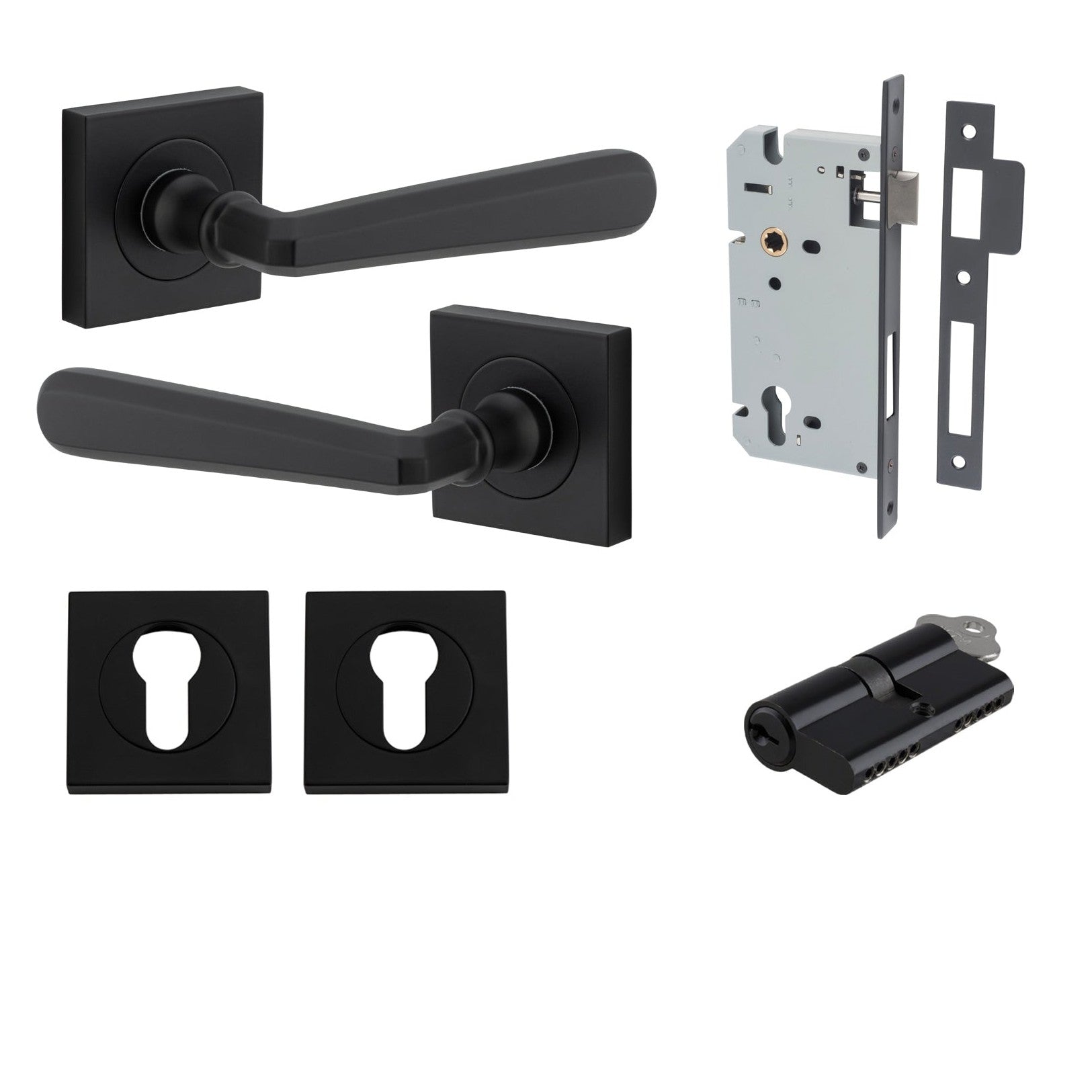 Included in Kit: Door Lever Copenhagen Square Rose Matt Black H52xW52xP61mm Entrance Kit, Mortice Lock Euro Matt Black CTC85mm Backset 60mm, Euro Cylinder Dual Function 5 Pin Matt Black L65mm KA1, Escutcheon Euro Concealed Fix Square Pair Matt Black H52xW52xP10mm